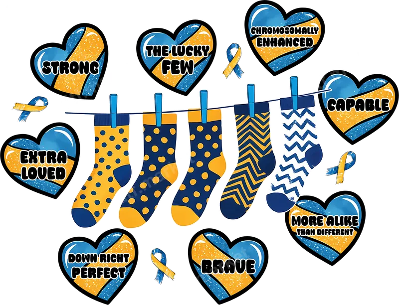 See allThis vibrant DTF transfer beautifully celebrates Down Syndrome awareness with empowering messages and symbolic imagery. The design features a charming clothesline with blue and yellow mismatched socks, a powerful visual associated with World Down Syndrome Day. Surrounding the socks are hearts adorned with inspiring phrases like "Strong," "The Lucky Few," "Chromosomally Enhanced," and "Down Right Perfect," alongside supportive blue and yellow ribbons. This ready to press design is perfect for spreading a message of love, acceptance, and empowerment. This powerful heat press transfer is ideal for advocates, families, teachers, and supporters of the Down Syndrome community. It's perfect for awareness events in March (World Down Syndrome Day), fundraisers, family gatherings, or simply as a daily statement of support. Create meaningful gifts for parents, grandparents, or anyone who wants to proudly show their dedication to inclusivity and celebrating unique abilities. This versatile design makes a thoughtful present that truly resonates. Our high-quality DTF transfers make customization incredibly easy, whether you're a professional or a DIY enthusiast. This heat press design works flawlessly on a wide range of materials, including cotton, polyester, and various fabric blends. For best results, apply with a heat press at 300-325°F for 15 seconds with medium pressure. It's also suitable for application with a household iron, providing clear instructions for a perfect finish. Enjoy the convenience of a ready to press transfer with absolutely no weeding required. Experience superior quality with our durable direct to film transfers. Each iron on transfer is crafted to deliver exceptionally vibrant colors and crisp details that truly stand out. Our advanced DTF film ensures a crack-resistant finish that's incredibly soft to the touch, providing maximum comfort and longevity. These apparel transfers are designed to withstand countless washes, maintaining their professional appearance on your t-shirt, tote bag, or any garment, making your statement last.