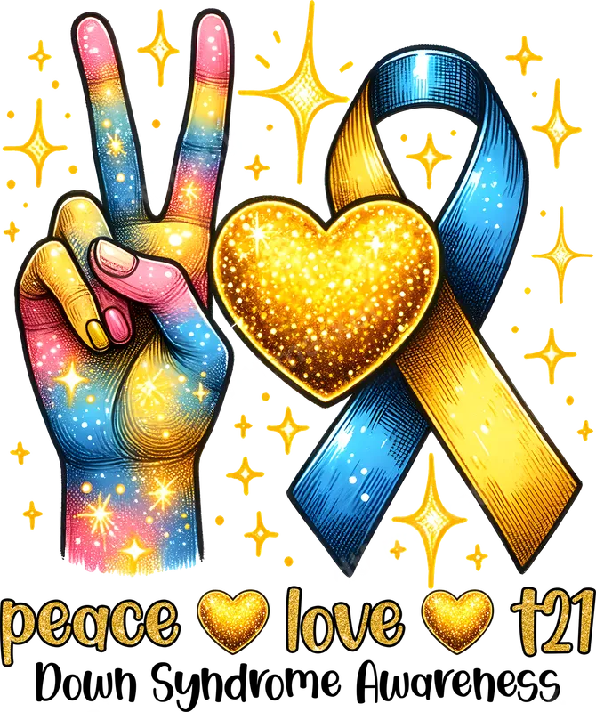 See allThis uplifting DTF transfer celebrates Down Syndrome Awareness with a beautiful and vibrant design. Featuring a dazzling, multi-colored peace sign hand, a sparkling golden heart, and the iconic blue and yellow awareness ribbon, this ready to press transfer radiates positivity and support. The empowering message "peace love t21 Down Syndrome Awareness" is rendered in a glittery gold font, making it a powerful statement piece for any garment. This direct to film transfer is perfect for individuals and families passionate about supporting the Down Syndrome community. Ideal for awareness events in March (World Down Syndrome Day), fundraisers, family gatherings, or everyday wear to show your love. It makes a thoughtful gift for parents, grandparents, siblings, or friends of individuals with Down Syndrome, allowing them to proudly display their advocacy on custom apparel. Applying this heat press transfer is simple and efficient, requiring no weeding or layering. Our premium DTF transfers adhere beautifully to a wide range of fabrics, including cotton, polyester, and various blends. For best results, use a heat press at 300-325°F for 15 seconds with medium pressure, then cold peel the film. A household iron can also be used, making it an accessible iron on transfer for everyone. Experience exceptional quality with our professional-grade DTF prints. Each shirt design boasts vibrant, true-to-color hues that resist cracking and peeling, ensuring a long-lasting finish. The durable film creates a soft-to-touch feel on the fabric, providing superior comfort compared to traditional vinyl transfer options. Create impactful and beautiful custom apparel with ease.