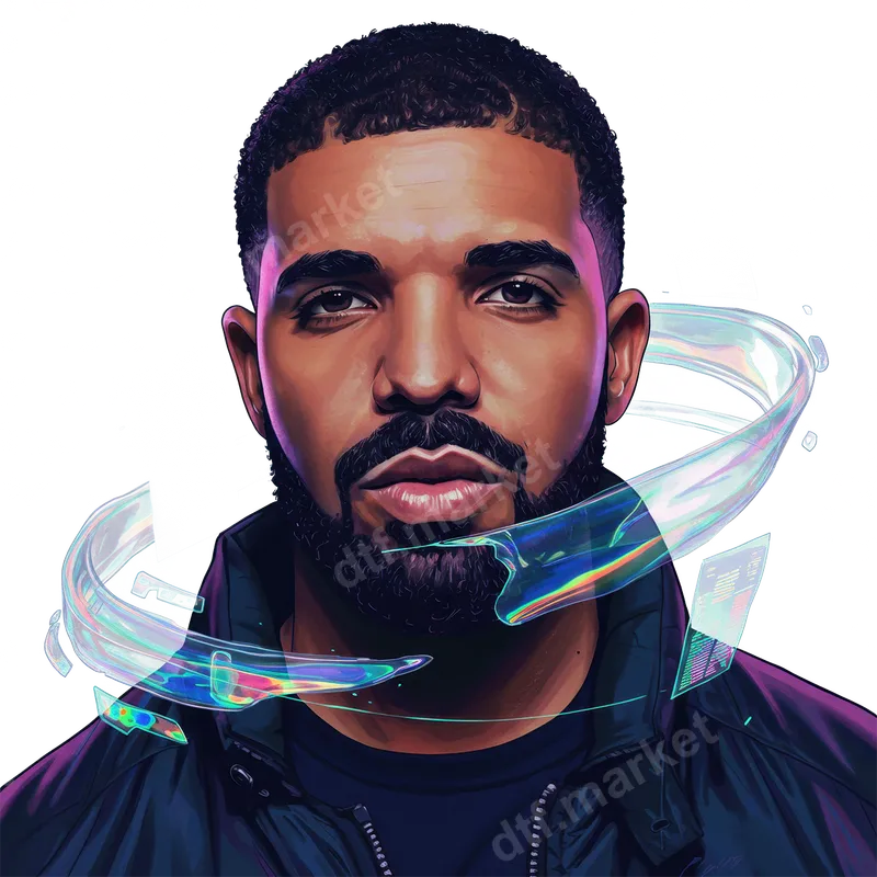 See allCapture the essence of modern music and iconic style with our Drake Holographic Portrait DTF transfer. This vibrant, ready to press design features a striking, stylized portrait of Drake, framed by ethereal, iridescent rings that shimmer with a futuristic glow. It's a visually captivating piece that blends realistic artistry with a touch of digital abstraction, making it perfect for anyone looking to add a unique, contemporary edge to their apparel. This unique apparel transfer is ideal for dedicated fans of Drake and hip-hop culture, or anyone who appreciates pop culture and cutting-edge design. It makes a fantastic gift for birthdays, holidays, or just to surprise a fellow fan. Whether you're customizing a shirt for a concert, creating unique merchandise, or simply showing off your favorite artist, this heat press design adds undeniable flair to any garment. Our premium direct to film transfer is designed for effortless application across a wide range of fabrics, including cotton, polyester, and blends. Achieve professional results with a heat press at 300-325°F for 15 seconds with medium pressure, or apply it using a household iron for convenience. Unlike traditional vinyl transfers, there's no weeding required, making your customization process quick and seamless. Experience superior quality with this heat press ready decal. Each DTF transfer is crafted to deliver incredibly vibrant colors that pop, exceptional detail, and a soft, smooth feel that integrates seamlessly with your fabric. The durable film ensures excellent washability and resistance to cracking or peeling, ensuring your custom shirt design looks fantastic wear after wear. Transform ordinary apparel into extraordinary statements with dtf.market.