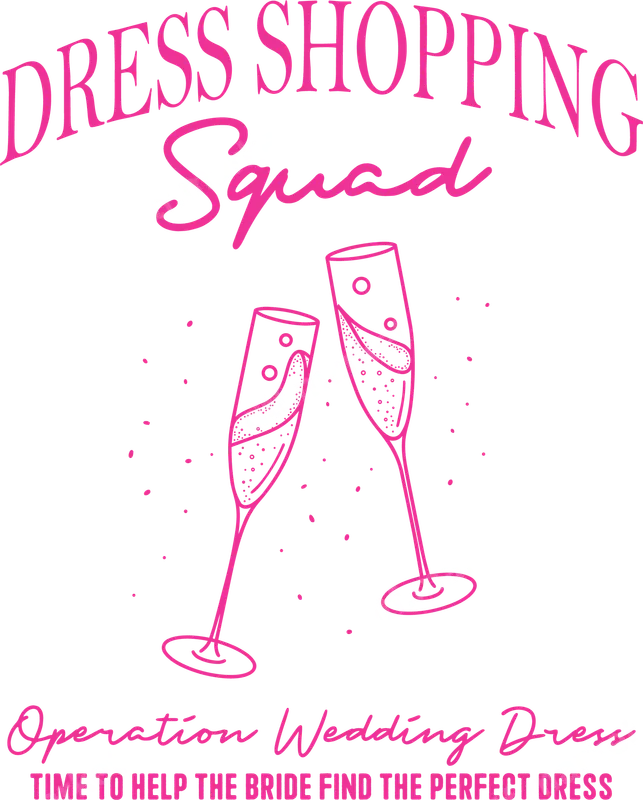 See allThis vibrant "Dress Shopping Squad" DTF transfer is perfect for celebrating the exciting journey of finding the perfect wedding dress. Featuring elegant script typography in bright pink, complemented by two toasting champagne flutes with celebratory bubbles, this design embodies the joy and camaraderie of bridal preparations. It's a ready to press design, making it effortless to create matching outfits for the entire bridal party. Ideal for the bride-to-be, bridesmaids, maid of honor, and the mother of the bride, this direct to film transfer is perfect for bridal shower gifts, bachelorette parties, or as a fun surprise for the actual dress shopping excursion. Imagine the laughter and memories made while sporting these matching designs, commemorating "Operation Wedding Dress: Time to help the bride find the perfect dress." It's a fantastic way to bond and show support for the future Mrs. Applying this high-quality heat press transfer is simple and efficient. It adheres beautifully to a wide range of materials, including cotton, polyester, and various fabric blends. For best results, use a heat press at 300-325°F for 15 seconds with medium pressure. Even household iron users can achieve great results by applying firm, even pressure. Best of all, there's no weeding required, saving you time and effort. Our DTF transfers are crafted using professional-grade film and inks, ensuring exceptional vibrancy and durability. The colors are striking, the details are crisp, and the transfers are designed to be crack-resistant and incredibly soft to the touch once applied. With strong adhesive properties, this t-shirt transfer will withstand countless washes, keeping your celebratory apparel looking fantastic for years to come.
