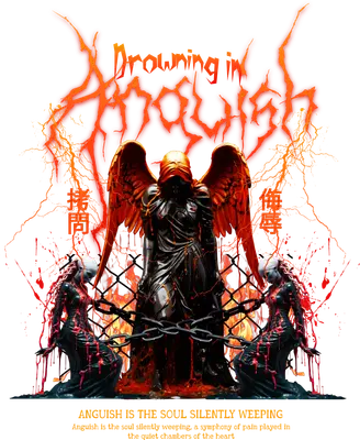 The "Drowning in Anguish" DTF transfer presents a striking, dark gothic scene. A formidable hooded angel figure with fiery wings dominates the center, surrounded by chains, molten elements, and blood-red splatters. Two chained female figures, echoing a sense of despair, flank the central entity. The intricate artwork, complete with jagged text and subtle Japanese characters meaning "torture" and "insult," conveys a powerful narrative of emotional depth and raw expression. This complex and visually rich design is ready to press, offering an instant upgrade to any garment. This dramatic iron on transfer is perfect for individuals drawn to heavy metal, gothic fashion, dark fantasy art, or tattoo-inspired aesthetics. Ideal for creating unique apparel for music festivals, rock concerts, Halloween events, or simply expressing a bold personal style. Small businesses specializing in alternative clothing, tattoo parlors, or custom t-shirt shops will find this heat transfer design an excellent addition to their edgy inventory, appealing to customers seeking powerful, expressive graphics. Applying this captivating heat press transfer is simple and efficient. It adheres flawlessly to a wide range of fabrics, including cotton, polyester, cotton-poly blends, and even nylon. Achieve professional results using a heat press at 300-325°F for 15 seconds with medium pressure, or apply with a household iron. No tedious weeding is required; just peel and press. This custom t-shirt transfer transforms hoodies, sweatshirts, tote bags, and denim jackets into wearable art. For longevity, wash garments inside out and tumble dry on low heat. Experience superior quality with this ready to press transfer. It boasts vibrant, full-color printing that captures every fine detail of the intricate design, from the fiery textures to the expressive figures. The result is a crack-resistant image that feels soft to the touch, avoiding the heavy, stiff feel often associated with vinyl transfers. Each direct to film transfer is meticulously printed on premium DTF film, featuring a strong adhesive backing to ensure professional, long-lasting results for all your apparel and accessory projects.