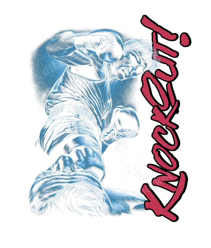 See allThe design features a powerful boxing scene, capturing the exhilarating moment of a knockout punch. One boxer is shown delivering a forceful blow, while their opponent is down, emphasizing the intensity and drama of the sport. The artwork has a vintage, almost comic book feel, rendered in cool blue tones with a bold, vertical red "Knockout!" text. This high-quality DTF transfer is a ready to press design, perfect for making a strong statement. This dynamic apparel transfer is ideal for boxing enthusiasts, MMA fans, athletes, and anyone who appreciates the grit and determination of combat sports. It’s perfect for gym wear, sports events, fight night parties, or as a unique gift for a coach, fighter, or a friend who loves the ring. Easily customize t-shirts, tank tops, hoodies, or even duffle bags to showcase your passion for boxing with this exciting heat press design. Our direct to film transfers are incredibly versatile and can be applied to a wide range of fabrics, including cotton, polyester, and cotton-poly blends, making them suitable for almost any garment. Application is straightforward: use a heat press at 300-325°F for 15 seconds with medium pressure, or apply with a household iron. These iron on decals require no weeding or masking, saving you time and effort for a professional finish every time. Experience superior quality with our professional-grade DTF transfers. Each heat transfer ensures vibrant colors, excellent wash durability, and resistance to cracking and peeling, keeping your designs looking fresh. The strong adhesive used on our DTF film ensures a long-lasting bond, while the finished print remains soft and flexible to the touch. You're getting a durable, professional-grade iron on that stands the test of time.