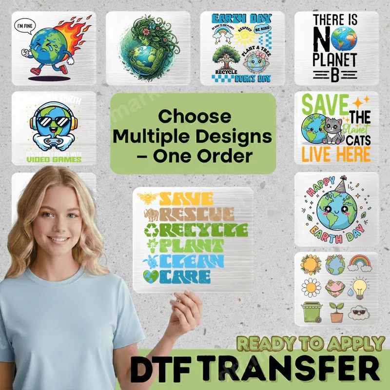 See allThis exclusive collection features a variety of vibrant DTF transfer designs, all centered around Earth Day and environmental awareness. From humorous takes like the "I'm Fine" burning Earth and the "No Planet B" slogan, to charming illustrations of our planet gaming or surrounded by cats, each design champions eco-conscious living. These high-quality direct to film transfers are ready to press, offering unique ways to express your love for Earth with a mix of playful, motivational, and iconic imagery. Perfect for environmental advocates, teachers, students, and anyone passionate about sustainability, these heat transfer designs are ideal for Earth Day events, school projects, or everyday wear to spread awareness. They make thoughtful gifts for eco-conscious friends, family, or as unique giveaways for environmental organizations. Whether you're celebrating our planet's birthday or simply want to show your commitment to conservation, this collection has a design for every eco-warrior. Applying these heat press ready designs is simple and hassle-free. Our iron on transfers work beautifully on a wide range of fabrics including cotton, polyester, and various blends, ensuring versatility for your projects. For best results, use a heat press at 300-325°F for 15 seconds with medium pressure. A household iron can also be used with careful application. Enjoy professional-looking results without the tedious weeding typically associated with vinyl transfer designs. Experience exceptional quality with our professional-grade DTF transfers. Each apparel transfer boasts incredibly vibrant colors that pop, superior stretch and crack-resistance, and a soft-to-touch finish that feels great on any garment. Printed on durable DTF film with a strong, long-lasting adhesive, these ready to press transfers are designed to withstand numerous washes, ensuring your eco-friendly message remains bold and clear for years to come.