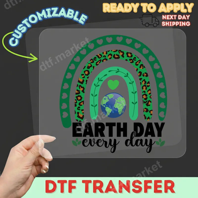 See allThis eye-catching "Earth Day Every Day" DTF transfer features a unique green rainbow design, complete with heart accents, lush vine patterns, and a trendy leopard print arch, all centered around a vibrant globe illustration. This ready to press transfer is perfect for showcasing your commitment to environmental awareness with a touch of modern style. It’s a powerful visual statement celebrating sustainability and our planet. This versatile design is ideal for environmental advocates, nature lovers, teachers, and anyone passionate about protecting our world. It's perfect for Earth Day celebrations, environmental events, school projects, or as an everyday reminder to live sustainably. It makes a thoughtful and unique gift for friends, family, or colleagues who care deeply about ecological issues and want to spread awareness through their apparel. Applying this direct to film transfer is effortless. It adheres beautifully to a wide range of materials, including cotton, polyester, and various fabric blends. For best results, use a heat press at 300-325°F for 15 seconds with medium pressure, then peel cold. You can also achieve great results with a household iron, ensuring consistent heat and firm pressure. No tedious weeding is required, making your custom apparel projects quick and enjoyable. This high-quality heat press design will save you time and effort. Our DTF transfers are crafted using professional-grade film and inks, ensuring exceptional vibrancy and durability. The colors are rich and true to the design, resisting cracking and fading even after multiple washes. The final result is a soft-to-the-touch apparel transfer that integrates seamlessly with your garment, providing a high-quality finish that rivals screen printing. Get a professional-looking iron on transfer every time.