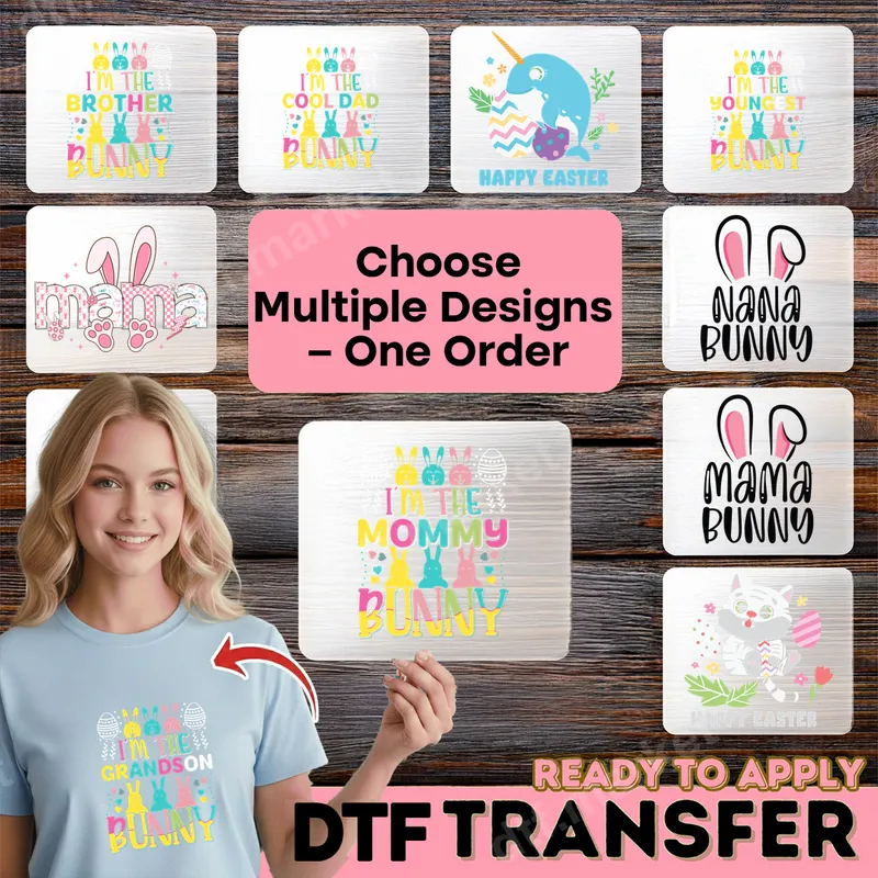 See allGet ready for Easter with our delightful DTF transfers! This festive collection features adorable 'I'm the [Role] Bunny' phrases for family members, decorated with playful bunnies, colorful Easter eggs, and hearts. You’ll also find sweet 'Mama Bunny,' 'Nana Bunny,' a cheerful narwhal 'Happy Easter,' and a cute tiger/cat character. Each design is a ready to press heat transfer, bringing vibrant pastel colors and a joyful spirit to your holiday apparel. These versatile heat press designs are perfect for creating matching family outfits for Easter egg hunts, holiday gatherings, or spring celebrations. They make wonderful personalized gifts for grandparents, parents, and children, allowing everyone to show off their special 'bunny' role. Transform garments into memorable keepsakes with these easy-to-apply iron on transfers, ideal for family photos or thoughtful presents. Our high-quality heat press transfers apply effortlessly to fabrics like 100% cotton, polyester, and blends. For best results, use a heat press at 300-325°F for 15 seconds with medium pressure. These ready to press transfers also work well with a household iron, ensuring even pressure. No weeding or layering is involved, saving you time. Just press and peel for a professional finish on your t-shirt transfer. Experience superior quality with our DTF transfer technology. Each design boasts incredibly vibrant colors and sharp details. Our professional DTF film ensures excellent durability, resisting cracking and fading even after multiple washes, maintaining a soft, flexible feel. The strong adhesive guarantees a long-lasting bond, making your custom apparel transfer a cherished item. Elevate your garments with these top-tier, ready-to-apply designs.