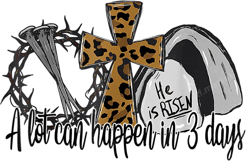 See allCelebrate the profound message of Easter and resurrection with this striking DTF transfer featuring a unique blend of faith symbols. The design showcases a stylish leopard print cross, an empty tomb boldly declaring "He is RISEN," the somber crown of thorns, and the crucifixion nails, all united by the powerful phrase "A lot can happen in 3 days." This ready to press design encapsulates the victory and hope of Christian faith in a modern, artistic way. This versatile heat press design is perfect for anyone looking to express their faith with a contemporary edge. Ideal for Christian believers, church groups, or individuals seeking meaningful religious apparel, it makes an excellent iron on transfer for Easter celebrations, Lent observances, Bible study events, or as an inspiring gift for friends and family. Applying this vibrant apparel transfer is simple and effective. It adheres beautifully to a wide range of materials, including cotton, polyester, and various fabric blends. For best results, use a heat press at 300-325°F for 15 seconds with medium pressure, then peel cold. No frustrating weeding is required, making customization quick and effortless, even with a household iron for smaller projects. Our professional-grade DTF transfers deliver exceptional quality. Expect vivid colors that pop, superior stretch and crack resistance for lasting wear, and a soft, comfortable feel on any garment. Each shirt design is printed on durable DTF film with a strong adhesive, ensuring your custom transfer looks fantastic wash after wash.