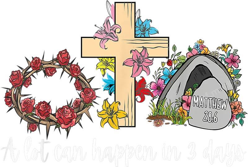 See allCelebrate the essence of faith with this beautiful "A Lot Can Happen in 3 Days" DTF transfer. This vibrant design features significant Christian symbols: a thorny crown adorned with roses, a cross blossoming with delicate lilies, and the empty tomb surrounded by cheerful flowers, boldly displaying the scripture Matthew 28:6. This ready to press design perfectly captures the powerful message of resurrection and new life. This inspirational heat transfer is ideal for anyone looking to express their Christian faith, especially during the Easter season, Holy Week, or other religious observances. It makes a thoughtful gift for church members, youth groups, Sunday school teachers, or anyone who cherishes the Easter story. Customize your apparel for church events, faith gatherings, or everyday wear to share a message of hope. Our premium direct to film transfer is incredibly versatile, suitable for application on a wide range of materials including 100% cotton, 100% polyester, and cotton/poly blends. Easily apply this heat press transfer using a standard heat press at 300-325°F for 15 seconds with medium pressure, followed by a cold peel. No tedious weeding is required, making your crafting process smooth. It can also be applied with a household iron for smaller projects. Experience superior quality with every t-shirt transfer. These designs boast exceptionally vibrant colors, are highly crack-resistant, and offer a soft, comfortable feel on any garment. Crafted from professional-grade DTF film with a strong adhesive, our iron on transfers are designed for long-lasting durability, ensuring your faith-inspired creations stand the test of time and wash.