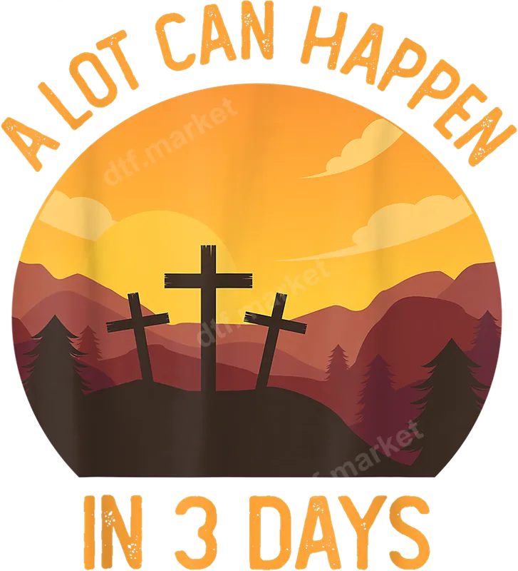 See allShowcase your faith and hope with this powerful 'A Lot Can Happen In 3 Days' DTF transfer. This vibrant design features three rustic crosses silhouetted against a beautiful, warm sunset or sunrise landscape, symbolizing the profound message of Easter and the resurrection. Perfect for personalizing your apparel, this ready to press transfer brings a meaningful touch to any garment, making it a powerful statement of belief. This inspirational heat transfer is ideal for Christian individuals, church groups, youth ministries, and anyone seeking to express their faith. It’s perfect for Easter celebrations, Resurrection Sunday services, Good Friday events, or as a thoughtful gift for baptisms, confirmations, or everyday spiritual wear. Share the message of hope and redemption with this unique apparel transfer, designed to inspire and uplift. Applying this iron on transfer is simple and efficient. It works seamlessly on a wide range of fabrics including cotton, polyester, and their blends. For best results, use a heat press at 300-325°F for 15 seconds with medium pressure, followed by a cold peel. No weeding or layering is required, making your custom clothing projects quick and hassle-free. For home users, a household iron can also be used with care. Experience professional quality with every DTF transfer. Our designs are printed on premium DTF film using high-quality inks, ensuring vibrant colors that are crack-resistant and soft to the touch. The strong adhesive guarantees excellent durability and washability, so your faith-inspired creation will look great for years to come. This high-definition heat press ready design ensures a crisp, detailed finish on all your DIY projects.