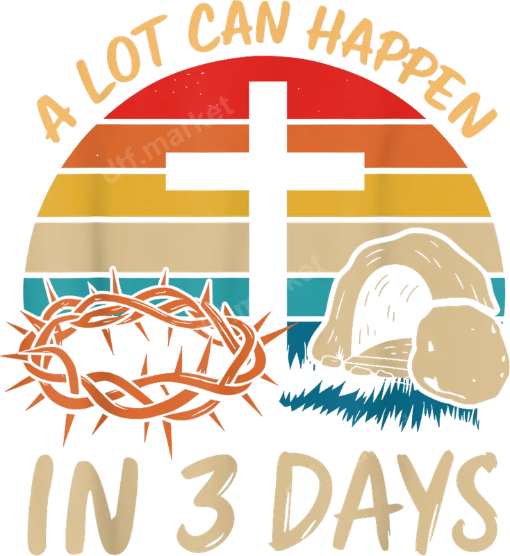 See allThis vibrant DTF transfer features a powerful Easter message: "A Lot Can Happen In 3 Days." The design showcases a distressed retro sunset backdrop, prominently featuring a cross, a crown of thorns, and an empty tomb – iconic symbols of the resurrection. This high-quality, ready to press transfer is perfect for expressing profound faith with a touch of vintage style. Ideal for devout Christians, church groups, and anyone celebrating the true meaning of Easter, this design makes a meaningful statement. It’s perfect for creating custom apparel for Easter Sunday services, faith-based events, or as a thoughtful gift for friends and family who cherish their spiritual journey. Use this versatile heat transfer to personalize items for church fundraisers or youth group activities. Applying this iron on transfer is simple and efficient. It works beautifully on a wide range of materials, including cotton, polyester, and various fabric blends. For best results, use a heat press at 300-325°F for 15 seconds with medium pressure. A household iron can also be used following specific instructions. The best part? There’s absolutely no weeding required, saving you time and effort. Experience superior quality with this durable t-shirt transfer. Our direct to film transfers boast vibrant colors, exceptional detail, and a soft-to-touch finish that won't crack or peel. Crafted using professional DTF film and strong adhesive, these transfers ensure your designs stay vivid and intact, wash after wash. Elevate your garments with a long-lasting, professional look.