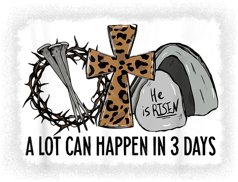 See allThis impactful DTF transfer beautifully illustrates the heart of the Easter story, featuring a crown of thorns, nails, a stylish leopard print cross, and an empty tomb with "He is RISEN" on the stone. Below these powerful symbols, the phrase "A LOT CAN HAPPEN IN 3 DAYS" encapsulates the profound message of Christ's resurrection. This ready to press transfer brings a meaningful and fashionable statement to any garment, perfect for celebrating faith. Ideal for devout Christians, church groups, or anyone who wants to share a message of hope and renewal, this heat press design is perfect for Easter Sunday, Bible study events, or everyday faith expression. It makes a thoughtful gift for pastors, Sunday school teachers, or family members. Create custom apparel for spiritual retreats, youth events, or personal devotion. Applying this vibrant heat transfer is simple for both beginners and experienced crafters. It adheres flawlessly to a wide range of materials, including cotton, polyester, and blends. Use a heat press at 300-325°F for 15 seconds with medium pressure, or apply it easily with a household iron. Enjoy a professional finish without the hassle of weeding, making your crafting process smooth and efficient. Our high-quality iron on transfers are crafted using professional DTF film, ensuring vivid colors and exceptional durability. The design is crack-resistant, peel-resistant, and maintains a soft touch on your chosen fabric. With strong adhesive and superior ink, this apparel transfer promises a lasting, professional look that stands up to washes and wear, allowing you to confidently express your faith.