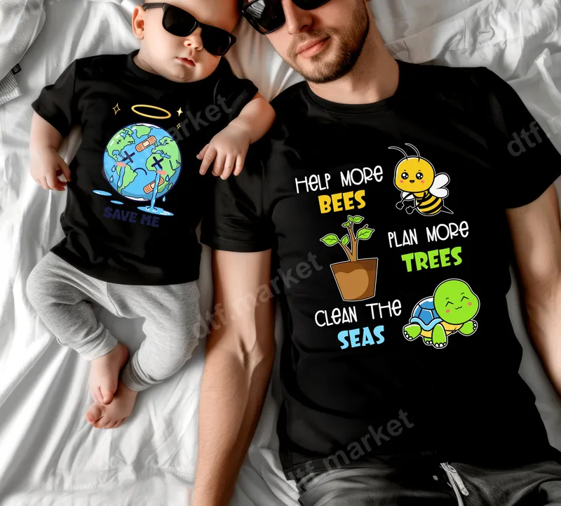 See allEmbrace the spirit of environmental stewardship with this charming DTF transfer set, perfect for spreading a vital message. One design features our beloved Earth, looking a bit distressed with band-aids and a halo, pleading 'SAVE ME,' while the other joyfully encourages us to 'Help More Bees, Plan More Trees, Clean The Seas,' accompanied by adorable illustrations of a bee, a potted plant, and a cheerful turtle. This vibrant, ready to press design is ideal for anyone passionate about protecting our planet. This eco-conscious heat transfer is perfect for environmental activists, nature lovers, and especially families who want to share a meaningful message. It makes a thoughtful gift for Earth Day, school events, or any occasion celebrating our planet. Create adorable matching parent-child shirts or outfits, inspiring young minds to care for the environment from an early age. Applying this high-quality iron on decal is incredibly simple, making customization a breeze for everyone. Designed for versatility, it adheres beautifully to a wide range of fabrics including cotton, polyester, and their blends. Achieve professional results with a heat press set to 300-325°F for 15 seconds with medium pressure, or easily use a household iron. Best of all, there's absolutely no weeding required, saving you time and effort. Experience the difference of a premium heat press transfer. Our DTF transfers boast exceptionally vibrant colors that stand out, a soft-to-the-touch feel, and remarkable crack resistance for long-lasting wear. Each t-shirt transfer is produced on professional-grade DTF film with a strong, reliable adhesive, ensuring your designs remain crisp and intact wash after wash. Transform your apparel into a statement piece effortlessly.