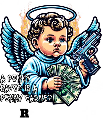 This captivating DTF transfer design merges classical cherubic innocence with a bold, urban edge. It features a stylized angel baby, complete with vibrant blue wings and a serene halo, juxtaposed gripping a handgun and fanning dollar bills. Flames flicker subtly in the background, adding an intense energy to the scene. Below, the phrase "A PENNY SAVED IS A PENNY EARNED" appears in a gritty, distressed font, with a prominent "R RESTRICTED" rating at the bottom, delivering a powerful statement of ironic humor. This ready to press design is a perfect blend of satire and street art. This unique iron on transfer is perfect for those who appreciate dark humor, pop culture references, and a rebellious aesthetic. Ideal for streetwear brands, independent crafters creating one-of-a-kind apparel, or anyone looking to make a statement. It’s a fantastic heat transfer design for individuals wanting to express their edgy personality or as a memorable gift for friends who love provocative art, meme culture, or urban fashion. Great for casual wear, music festival outfits, or simply adding a distinctive touch to your wardrobe. Applying this heat press transfer is simple and straightforward, making it accessible for both beginners and experienced crafters. It adheres flawlessly to a wide range of fabrics including cotton, polyester, cotton-poly blends, and even nylon. For optimal results, use a heat press at 300-325°F for 15 seconds with medium pressure, or follow instructions for a household iron. There's no tedious weeding required – just peel the film and press! Perfect for creating custom t-shirts, hoodies, sweatshirts, tote bags, denim jackets, and even canvas shoes. For lasting durability, wash garments inside out and tumble dry on low. Experience premium quality with this ready to press transfer. It boasts vibrant, full-color printing with incredibly fine details that truly bring the edgy design to life. Enjoy a soft, smooth feel on your garment – unlike heavy vinyl, it’s crack-resistant and comfortable to wear. Each direct to film transfer is meticulously printed on high-grade DTF film, featuring a strong, reliable adhesive backing to ensure professional-grade application and exceptional longevity on all your projects.