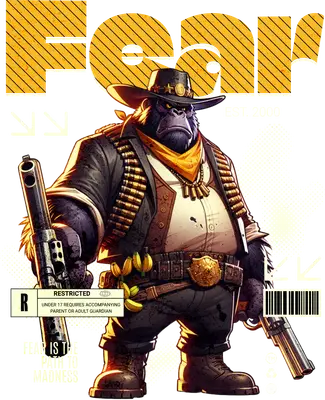 This striking DTF transfer features a formidable gorilla decked out as a Wild West outlaw, complete with a cowboy hat, bandoliers, twin revolvers, and even a cluster of bananas tucked into his belt. Above this imposing figure, the word "FEAR" is boldly displayed in a distressed, striped yellow font, with additional "Restricted" rating text and the ominous phrase "FEAR IS THE PATH TO MADNESS." The design blends gritty street style with a touch of unexpected humor, making it a truly unique and conversation-starting ready to press graphic. This design is perfect for anyone looking to make a bold statement, whether they're a streetwear aficionado, a gamer, or someone who appreciates edgy, pop-culture-inspired apparel. It’s an ideal iron on transfer for crafting personalized gifts for friends who love unique graphic tees, or for small t-shirt businesses seeking distinctive heat transfer designs for their inventory. Great for casual wear, themed parties, or even as a standout piece for convention attendees. Applying this heat press transfer is incredibly easy, making it suitable for both professional crafters and DIY enthusiasts. It adheres beautifully to a wide range of materials, including cotton, polyester, cotton-poly blends, and even nylon. Achieve professional results using a heat press (recommended at 300-325°F for 15 seconds with medium pressure) or a household iron. There's no tedious weeding required—simply peel and press! This versatile design is perfect for custom t-shirts, cozy hoodies, trendy tote bags, and even personalized denim jackets, allowing you to transform everyday items into unique fashion statements. For lasting durability, wash garments inside out and tumble dry on low heat. Our ready to press transfers boast vibrant, full-color printing that captures every intricate detail of the gorilla outlaw design, from the subtle textures of his vest to the glint of his revolvers. Experience a soft, flexible feel on your garment—no heavy, stiff vinyl here. Each direct to film transfer is produced using premium DTF film and high-quality inks, ensuring a strong, long-lasting bond and brilliant, crack-resistant results that stand up to countless washes.