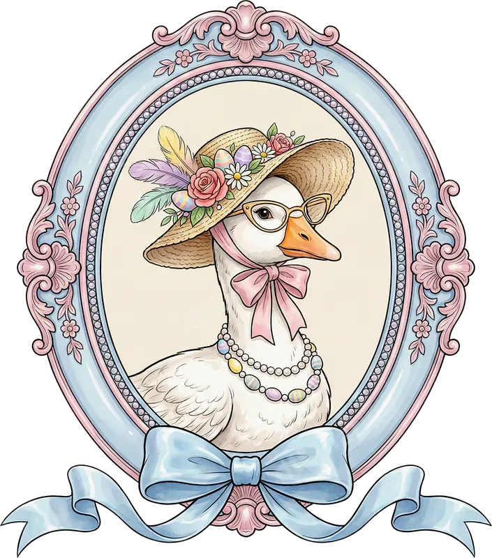 See allThis charming DTF transfer features a sophisticated white goose, elegantly dressed for spring. She wears a straw hat adorned with roses, daisies, feathers, and pastel Easter eggs, along with stylish cat-eye glasses and a pearl necklace with egg-shaped beads. The portrait is framed in an ornate, vintage-inspired oval border of soft blue and pink. This ready to press design brings a whimsical, refined aesthetic to any project. This delightful heat transfer is perfect for adding elegant charm to your wardrobe or gifts. Ideal for Easter, spring festivals, or everyday wear, it appeals to crafters, boutique owners, and those who love unique animal and vintage designs. Create memorable t-shirts for egg hunts or personalized hoodies for garden parties. It makes a thoughtful iron on gift for bird lovers, grandmothers, or anyone enjoying whimsical cottagecore aesthetics. Applying this apparel transfer is straightforward for a professional finish. Our heat press ready transfers work on 100% cotton, polyester, and blends. Use a heat press at 300-325°F for 15 seconds with medium pressure, then cool completely before peeling. A second press for 5-10 seconds is recommended. No weeding required—this direct to film transfer presses precisely every time. Our DTF transfers offer superior quality with vibrant colors and sharp details. Crafted on professional-grade film, designs ensure excellent wash durability, resisting cracking and fading. The transfer integrates softly with fabric, providing comfort and long-lasting wear. Trust dtf.market for premium heat press designs that deliver stunning results.