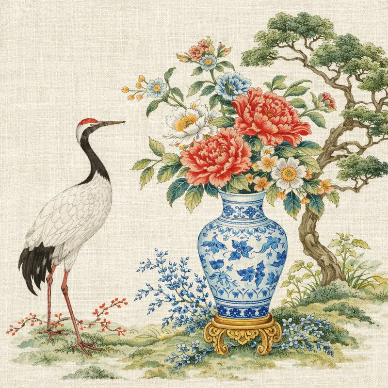 See allThe design showcases a beautiful red-crowned crane standing beside a classic blue and white oriental vase overflowing with lush red peonies and delicate white and blue flowers. A gnarled bonsai-style tree frames the background, all set against a subtle, textured linen-like backdrop. This exquisite piece captures the tranquility and artistry of traditional Asian illustration, making it a truly elegant DTF transfer. It arrives ready to press, allowing you to infuse your garments with sophisticated, vintage-inspired charm instantly. This unique design is perfect for those who appreciate fine art, East Asian aesthetics, or a touch of vintage elegance in their style. Ideal for art enthusiasts, collectors of unique apparel, or anyone looking to add a serene and cultured touch to their everyday wear. It makes a thoughtful and distinctive gift for birthdays, Mother's Day, or any special occasion for friends and family who cherish beautiful, timeless designs. Elevate your personal style or create custom gifts that stand out with this exceptional design. Our versatile heat transfer is designed for effortless application across a wide range of fabrics, including cotton, polyester, and various blends. Achieve professional results easily with a heat press set to 280-300°F for 6-10 seconds with medium pressure, followed by an instant peel. For those without a heat press, a household iron can also be used following careful instructions. Say goodbye to tedious weeding and complex layering; this ready to press transfer streamlines your custom apparel projects, making customization simple and fun. Experience superior quality with our direct to film transfer, featuring incredibly vibrant colors and sharp details that truly bring this intricate design to life. Crafted from premium professional DTF film, it boasts exceptional crack resistance and a remarkably soft hand feel once applied, ensuring your garments remain comfortable and stylish. The strong adhesive guarantees a long-lasting bond, allowing your customized items to withstand numerous washes without fading or peeling. Create durable, high-quality personalized apparel every time.