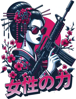 Empowered Geisha Girl Power DTF Transfer with Rifle & Cherry Blossoms