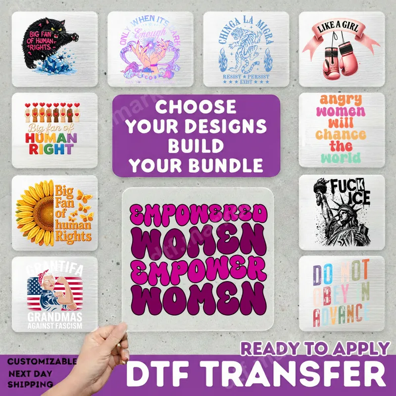 See allThe design features the powerful message "Empowered Women Empower Women" in a bold, retro-inspired font, embodying a vibrant spirit of sisterhood and solidarity. This high-quality DTF transfer is an inspiring statement piece, perfect for anyone looking to showcase their support for women's empowerment. Our ready to press transfer ensures a seamless application, allowing you to create custom apparel with ease and confidence. This empowering design is ideal for feminists, women's rights advocates, community leaders, and anyone who believes in lifting up others. It's a fantastic choice for International Women's Day events, rallies, conferences, or as a meaningful gift for friends, mothers, daughters, or colleagues. Celebrate strength, unity, and inspiration by adding this unique heat press design to your wardrobe or gifting it to someone special. Our direct to film transfer is incredibly versatile, adhering beautifully to a wide range of fabrics including cotton, polyester, and various blends. Application is straightforward: simply use a heat press at 300-325°F for 15 seconds with medium pressure. For best results, a household iron can also be used following specific instructions. Enjoy the convenience of a ready to press transfer with no tedious weeding required, saving you time and effort. Experience professional-grade quality with every iron on transfer. Our DTF prints boast vibrant, long-lasting colors that resist cracking and peeling, ensuring your custom garments look great wash after wash. The finished transfer feels incredibly soft to the touch, seamlessly integrating with the fabric. Each heat transfer is produced using premium DTF film and strong adhesive, guaranteeing a durable and impressive finish for all your apparel projects.