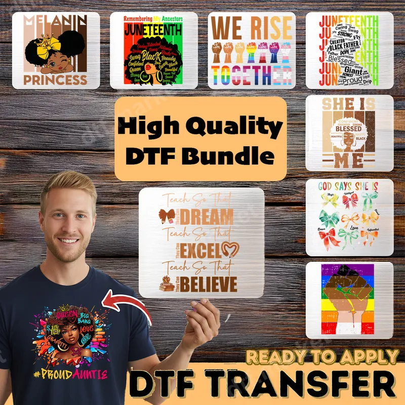 See allThis vibrant DTF transfer bundle offers a powerful collection of designs celebrating Black culture, empowerment, and education. Featuring "Melanin Princess," Juneteenth themes like "Remembering My Ancestors" and word clouds, uplifting messages such as "WE RISE TOGETHER" with diverse fists, "SHE IS" affirmations, and inspiring teacher quotes like "Teach So That I DREAM, EXCEL, BELIEVE," this ready to press collection is perfect for making a statement. Each design is meticulously crafted to deliver a bold and impactful message on your chosen apparel. This versatile bundle is ideal for individuals passionate about celebrating Juneteenth, Black History Month, or simply expressing pride and unity year-round. It's perfect for educators looking to inspire, or for anyone wanting to create meaningful gifts for friends, family, or colleagues. Whether you're customizing apparel for community events, family reunions, or personal wear, these heat press designs are sure to resonate. Create unique pieces for teachers, mothers, sisters, or anyone who embodies strength and resilience. Applying these high-quality iron on transfers is incredibly simple, making customization accessible for everyone. Our direct to film transfers adhere beautifully to a wide range of fabrics, including 100% cotton, polyester, and various blends. For best results, use a heat press at 300-325°F for 15 seconds with medium pressure. These designs are also compatible with a household iron, offering flexibility. Enjoy a hassle-free process with no weeding or masking required, saving you time and effort. Experience professional-grade results with our premium DTF transfers. Each design boasts incredibly vibrant colors that pop, superior durability, and excellent wash fastness, ensuring your creations look fantastic for longer. The advanced DTF film provides a soft, flexible feel that moves with the fabric, preventing cracking or peeling. With strong adhesive properties, these apparel transfers create lasting, high-definition graphics that stand out beautifully on any garment.