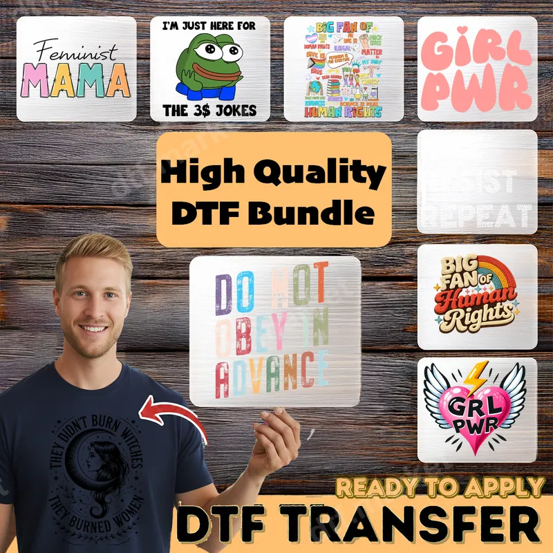 See allThis high-quality DTF transfer bundle offers eight powerful, expressive designs ready to press. It features "Feminist MAMA," "GIRL PWR" with a heart and wings, two "BIG FAN OF Human Rights" designs, and "DO NOT OBEY IN ADVANCE." Also included is "I'M JUST HERE FOR THE 3$ JOKES" with Pepe the frog, and "RESIST REPEAT." Each direct to film transfer is vibrant and impactful, covering social justice, empowerment, and contemporary humor, prepared for immediate application. This versatile collection of heat press designs is ideal for activists, feminists, meme enthusiasts, and anyone expressing beliefs through clothing. Perfect for rallies, casual wear, or unique gifts for those passionate about human rights and empowerment. Create custom apparel for International Women's Day, Pride events, or daily statements. These iron on decals are also fantastic for small business owners seeking trending designs without traditional hassle. Applying these premium heat press ready transfers is easy for beginners and experienced crafters. They adhere perfectly to 100% cotton, polyester, and blends. For best results, use a heat press at 300-325°F for 15 seconds with medium pressure, then peel warm or cool. A household iron can also be used. Enjoy no weeding or masking required – just press and go! Each apparel transfer is crafted with professional-grade DTF film and inks, guaranteeing exceptional quality and durability. Colors are vibrant, resistant to cracking and peeling, and maintain a soft, flexible feel. Our advanced adhesive ensures a strong, long-lasting bond, allowing your custom t-shirts, hoodies, and tote bags to withstand countless washes while retaining their striking appearance.