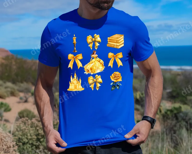 See allUnleash magic with this exquisite golden fairytale DTF transfer. This ready to press design features whimsical elements inspired by a beloved enchanted princess: a beautiful princess in a yellow gown, a majestic golden castle, delicate bows, classic books, an ornate candle, and an elegant rose. Each element boasts a soft watercolor style, creating a truly magical apparel transfer. This enchanting iron on transfer is perfect for anyone who adores classic fairytales and whimsical charm. It's ideal for creating personalized gifts for daughters, granddaughters, or any young-at-heart princess fan. Imagine custom t-shirts for a birthday party, matching family shirts for a magical theme park vacation, or unique tote bags. This design adds a special touch to any garment. Applying this heat press transfer is incredibly simple. Our premium direct to film transfers adhere beautifully to cotton, polyester, and blends. For best results, use a heat press at 300-325°F for 15 seconds with medium pressure, then cold peel. No tedious weeding or layering like traditional vinyl transfers – just press and go! A high-quality household iron can also be used with careful technique. Experience the superior quality of our DTF transfers. These designs offer vibrant colors, exceptional durability, and a soft-to-touch finish that feels like part of the fabric. Designed to resist cracking and fading, your custom creations will maintain their stunning appearance wash after wash. We use professional-grade DTF film and strong adhesive to ensure your heat press designs stand up to daily wear and tear.