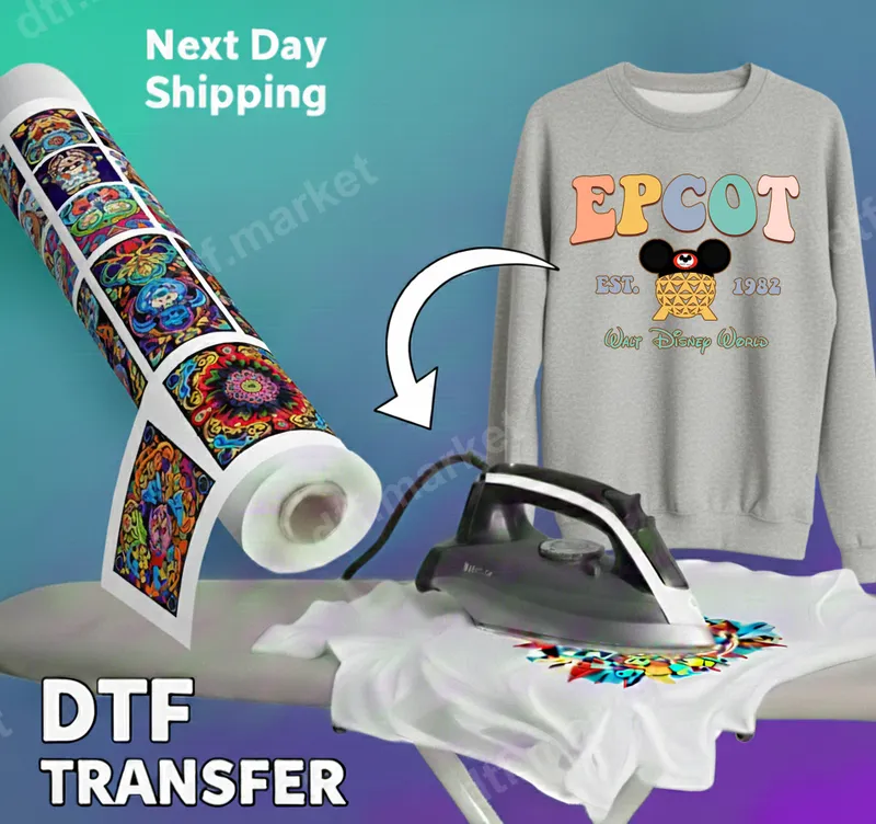 See allStep back in time to the magic of EPCOT with this vibrant retro DTF transfer. Featuring the iconic Spaceship Earth geodesic dome cleverly integrated into a Mickey Mouse silhouette, accompanied by "EPCOT EST. 1982" in groovy, pastel lettering and "Walt Disney World" in classic script. This ready to press design captures the nostalgic charm of Disney's past, making it a perfect heat transfer for anyone who loves vintage theme park style. This nostalgic iron on transfer is ideal for Disney fans, Epcot enthusiasts, and anyone planning a magical trip to Walt Disney World. It’s perfect for creating custom shirts for family vacations, birthday celebrations, or as a unique gift for a fellow Disney lover. Embrace the 80s vibe and create personalized apparel that stands out at the parks or in your everyday life. Applying this apparel transfer is simple and efficient. It’s compatible with a wide range of fabrics including 100% cotton, polyester, and cotton/poly blends. For best results, use a heat press at 300-325°F for 15 seconds with medium pressure, then cold peel. For household irons, apply firm, even pressure. Enjoy a professional finish without the hassle of weeding or layering, making your DIY projects a breeze. Crafted with high-quality DTF film and strong adhesive, this t-shirt transfer ensures brilliant colors, crisp details, and long-lasting durability. The design is crack-resistant, fade-resistant, and soft to the touch, providing a comfortable feel on any garment. Experience the ease and quality of a professional heat press design that will make your custom clothing look fantastic for years to come.