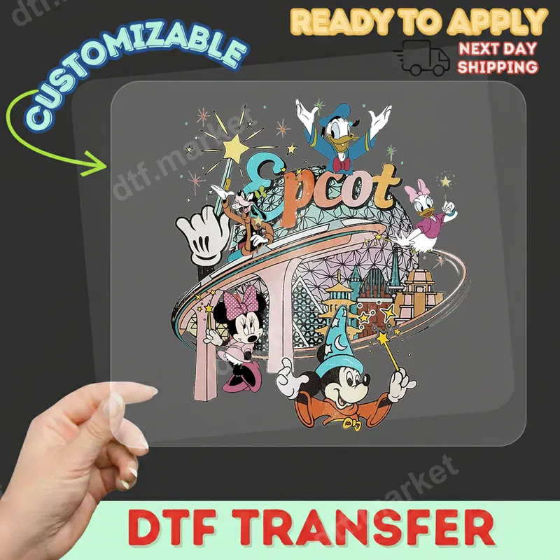 See allThe design features beloved Disney characters – Sorcerer Mickey, Minnie, Donald, Daisy, and Goofy – celebrating around the iconic Epcot Spaceship Earth. With "Epcot" boldly displayed and magical starbursts, this vibrant DTF transfer captures the wonder and excitement of a Walt Disney World visit. It's a whimsical, ready to press design perfect for bringing a touch of theme park magic to any item. This magical design is ideal for Disney fans of all ages, Epcot enthusiasts, and anyone planning a trip to Walt Disney World. Perfect for family vacation shirts, matching apparel for group trips, birthday gifts, or just to show off your love for the happiest place on Earth. Create unique custom apparel for travel, themed parties, or everyday wear. Applying this premium heat press transfer is incredibly easy! Our direct to film transfer works beautifully on a wide range of materials, including cotton, polyester, and various fabric blends. Simply use a heat press at 300-325°F for 15 seconds with medium pressure, or apply with a household iron. Enjoy professional results without any tricky weeding, making this iron on decal a hassle-free addition to your crafting projects. Experience superior quality with every t-shirt transfer. Our DTF transfers boast vibrant colors that truly pop, exceptional crack resistance, and a soft, flexible feel that won't weigh down your garment. Printed on professional-grade DTF film with a strong adhesive, this apparel transfer ensures long-lasting durability and a flawless finish, wash after wash.