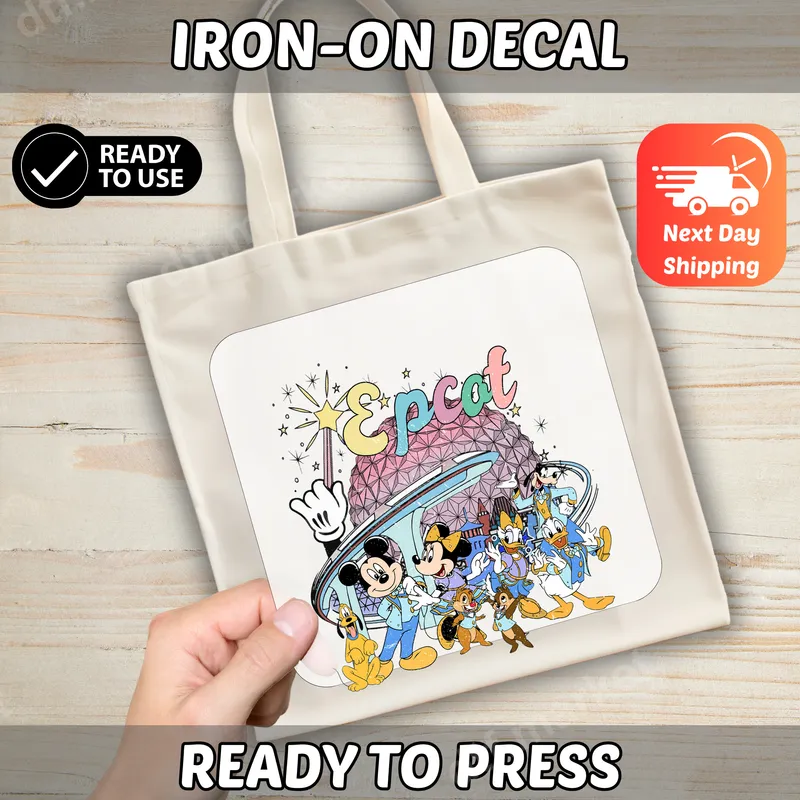 See allImmerse yourself in the magic of Epcot with this vibrant DTF transfer featuring beloved Disney characters. This ready to press design showcases Mickey Mouse, Minnie Mouse, Donald Duck, Daisy Duck, Goofy, Pluto, Chip, and Dale posing cheerfully in front of the iconic Spaceship Earth. With its charming pastel hues and classic cartoon style, it perfectly captures the nostalgic fun of a theme park adventure, making it an ideal choice for your next creative project. This delightful heat transfer is perfect for Disney enthusiasts of all ages planning a trip to Walt Disney World, celebrating a birthday, or simply wanting to add a touch of magic to their everyday wear. It makes an excellent gift for family members heading to Epcot or a fantastic way to create matching custom shirts for a group vacation. Easily personalize your wardrobe or accessories with this iconic Disney Parks design. Applying this high-quality iron on transfer is a breeze. Suitable for cotton, polyester, and most fabric blends, it requires no weeding or intricate steps. Simply use a heat press at 300-325°F for 15 seconds with medium pressure, or apply with a household iron. After pressing, allow the design to cool completely before peeling for a flawless finish. Crafted with professional-grade DTF film, this apparel transfer ensures vibrant colors that resist cracking and fading, maintaining its original charm wash after wash. The soft-touch feel integrates seamlessly with your fabric, providing a comfortable and durable finish. Elevate your garments with a professional-looking, long-lasting Disney heat press design that will surely turn heads.