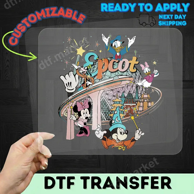 See allThis vibrant DTF transfer captures the magic of Epcot with beloved Disney characters. Featuring Mickey Mouse as Sorcerer Mickey, Minnie Mouse, Goofy, Donald Duck, and Daisy Duck, all playfully surrounding the iconic Spaceship Earth globe and various World Showcase pavilions. This ready to press design brings a nostalgic yet timeless charm, perfect for anyone who loves theme park adventures and classic animation. Ideal for Disney enthusiasts, families planning a trip to Walt Disney World, or anyone looking to add a touch of magic to their wardrobe. This heat press transfer makes a fantastic personalized gift for birthdays, family vacations, or to commemorate a special Epcot visit. It's a wonderful way for adults and children alike to show their love for Disney and Epcot. Our high-quality heat press ready transfer is incredibly versatile, applying seamlessly to cotton, polyester, and most fabric blends. Application is simple: use a heat press at 300-325°F for 15 seconds with medium pressure, or even a household iron following our detailed instructions. Best of all, there's no weeding required, making it a quick and easy iron on decal for custom apparel. Crafted with professional-grade DTF film, this t-shirt transfer delivers exceptional durability and vibrant colors that resist cracking and fading wash after wash. The design is soft to the touch, ensuring maximum comfort on any garment. Create professional-looking custom apparel with ease and enjoy a long-lasting, high-quality finish every time.