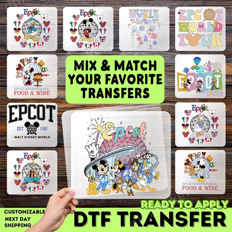 See allThis enchanting DTF transfer brings the magic of Epcot directly to your apparel. Featuring a delightful ensemble of beloved Disney characters – Mickey, Minnie, Donald, Goofy, Pluto, Chip, and Dale – joyfully strolling in front of the iconic Spaceship Earth, with a whimsical "Epcot" logo above. This ready to press design captures the spirit of adventure and fun found in the heart of Walt Disney World, perfect for showcasing your love for Disney and travel. Designed for Disney enthusiasts, Epcot visitors, and anyone planning a magical family vacation, this heat press transfer is ideal for creating custom outfits for your next trip to the parks. It makes a fantastic personalized gift for birthdays, holidays, or simply to celebrate a love for Disney. Show off your park pride or commemorate cherished memories with a unique iron on decal that truly stands out. Applying this professional-grade DTF transfer is simple and efficient. It adheres beautifully to a wide variety of materials, including cotton, polyester, and various fabric blends. For best results, use a heat press at 300-325°F for 15 seconds with medium pressure, then cold peel the film. No intricate weeding is required, making your crafting project quick and hassle-free, transforming ordinary garments into personalized masterpieces. Experience superior quality with our durable direct to film transfer. Each heat press design is crafted using premium DTF film, ensuring vibrant, true-to-color graphics that resist cracking, peeling, and fading wash after wash. The soft-touch finish integrates seamlessly with your fabric, providing a comfortable feel that looks and lasts like professional screen printing. Elevate your apparel with this long-lasting, high-quality t-shirt transfer.