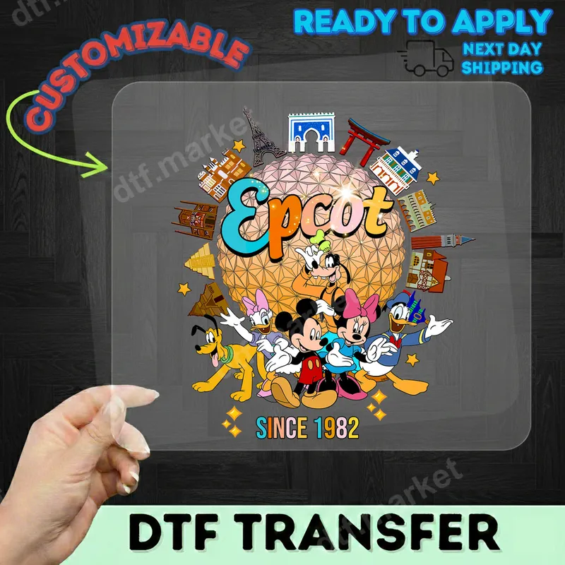 See allThis vibrant Epcot DTF transfer captures the magic of Walt Disney World, featuring the iconic Spaceship Earth globe surrounded by beloved World Showcase landmarks like the Eiffel Tower and Japanese Torii Gate. Classic Disney characters—Mickey Mouse, Minnie Mouse, Donald Duck, Daisy Duck, Goofy, and Pluto—joyfully gather around, with "SINCE 1982" commemorating Epcot's founding. It's a ready to press design perfect for adding Disney nostalgia and global adventure to any garment. This delightful heat press design is ideal for Disney vacationers, theme park enthusiasts, and fans of classic animation. Perfect for family trips, anniversary celebrations, or expressing Disney fandom, this iron on transfer makes a fantastic personalized gift. Create custom shirts for your travel group, memorable keepsakes for birthdays, or unique apparel for everyday wear. It's also great for vintage Disney collectors who appreciate the historical reference. Our high-quality direct to film transfer works flawlessly on cotton, polyester, and various fabric blends. Applying your design is simple: use a heat press at 300-325°F for 15 seconds with medium pressure, or follow instructions for a household iron. Unlike traditional vinyl transfer methods, there's no weeding required, making the application process quick and easy for anyone to achieve professional results. Experience superior quality with this durable apparel transfer. Printed using professional-grade DTF film, our transfers boast vibrant, crack-resistant colors and sharp details that last. The specialized ink and strong adhesive ensure a soft-to-the-touch finish that isn't stiff. Enjoy a long-lasting, professional-looking garment that maintains its charm wash after wash. This t-shirt transfer is built to endure, keeping your Disney memories alive.