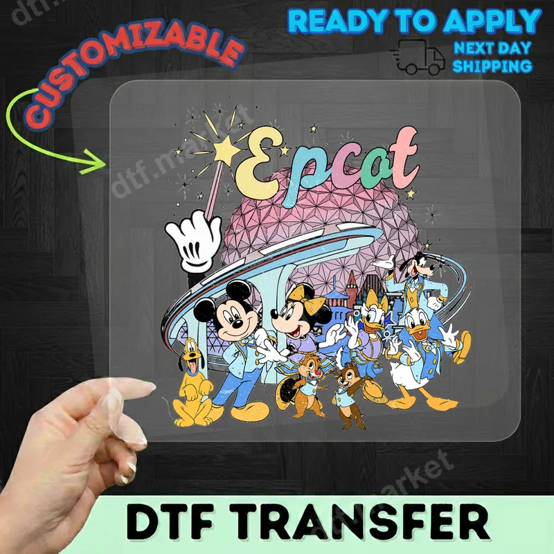See allCapture the magic of Epcot with this vibrant retro-inspired DTF transfer, featuring Mickey Mouse, Minnie Mouse, Pluto, Goofy, Donald Duck, Daisy Duck, and Chip 'n' Dale. All your favorite Disney friends are dressed in charming coordinated outfits, standing proudly in front of the iconic Spaceship Earth dome. The colorful 'Epcot' text and whimsical magic wand add to the joyful, nostalgic feel, making this a perfect ready to press design for any Disney enthusiast. This enchanting heat press design is ideal for Disney vacationers, families planning a trip to Walt Disney World, or anyone who loves classic Disney characters and Epcot. Create matching family shirts for your next theme park adventure, unique gifts for friends, or personalized apparel for birthday parties, family reunions, and fan gatherings. It’s also a fantastic iron on transfer for crafters looking to add a touch of magic to their creations. Applying this high-quality DTF transfer is simple and efficient. It works seamlessly on a wide range of materials, including cotton, polyester, and various fabric blends. For best results, use a heat press at 300-325°F for 15 seconds with medium pressure. Unlike traditional vinyl, there’s no weeding required, making your customization projects quicker and easier. You can also use a household iron for smaller projects, following our detailed instructions for a professional finish. Our direct to film transfers are known for their exceptional quality and durability. Expect vivid, true-to-life colors that pop on any garment. The design is crack-resistant, peel-resistant, and incredibly soft to the touch, ensuring a comfortable wear that lasts wash after wash. Manufactured with professional-grade DTF film and a strong adhesive, this t-shirt transfer delivers a premium, long-lasting finish for all your custom apparel.