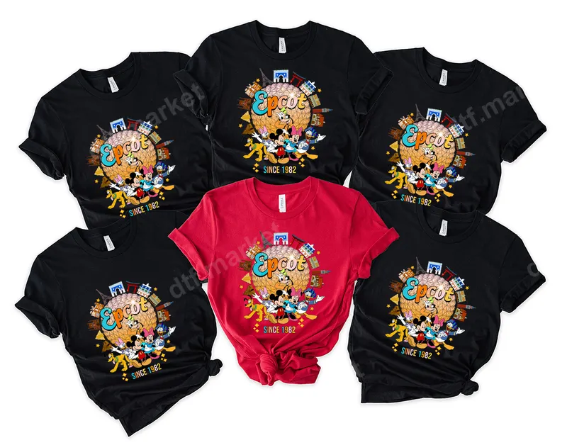 See allStep back in time to classic Epcot with this vibrant DTF transfer! Featuring Mickey, Minnie, Donald, Daisy, Goofy, and Pluto celebrating around the iconic Spaceship Earth, surrounded by miniature World Showcase landmarks. This dynamic design also proudly displays 'SINCE 1982', commemorating the park's opening year. It’s a nostalgic and joyful ready to press design perfect for any Disney fan. This Epcot heat transfer is ideal for family Disney vacations, group trips to Walt Disney World, or as a thoughtful gift for theme park enthusiasts and Disney collectors. Create matching t-shirts for your next Epcot Food & Wine Festival visit, celebrate an anniversary trip, or simply show your love for the magic of discovery and global culture. It’s also a fantastic iron on transfer for crafting personalized birthday gifts or holiday apparel. Applying your Epcot direct to film transfer is straightforward. It works seamlessly on a wide range of fabrics, including cotton, polyester, and various blends. For best results, use a heat press at 300-325°F for 15 seconds with medium pressure. Even a household iron can achieve great results by applying firm, even pressure. There's no complex weeding or layering required, making customization quick and easy. Experience professional-grade results with our premium heat press transfers. Each design is printed with vibrant, long-lasting colors on high-quality DTF film, ensuring excellent durability. The transfers are crack-resistant, soft to the touch, and designed to withstand countless washes, keeping your apparel looking fresh. You'll love the professional finish these t-shirt transfers provide.