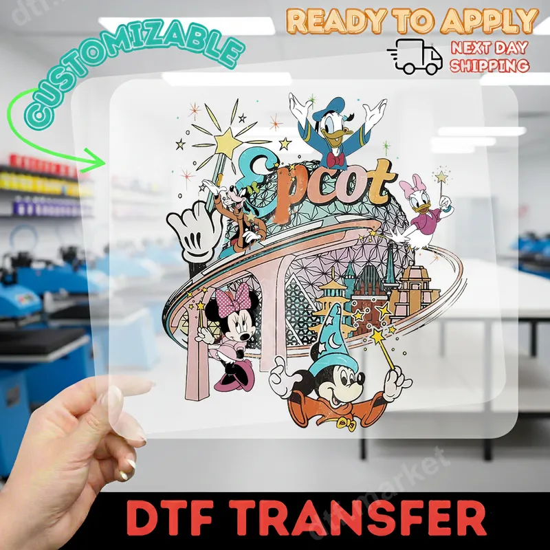 See allEmbrace the magic of Disney with this vibrant Epcot Squad DTF transfer, showcasing beloved characters like Sorcerer Mickey, Minnie Mouse, Donald Duck, Goofy, and Daisy Duck. This delightful design captures the essence of Epcot, featuring its iconic Spaceship Earth backdrop with playful stars and magical wands. It’s a fantastic ready to press transfer for anyone looking to add a touch of Disney charm to their wardrobe or accessories. This whimsical direct to film transfer is perfect for Disney enthusiasts, Epcot visitors, and families planning their next magical vacation. It makes an excellent personalized gift for birthdays, family trips, or just to celebrate a love for Disney World. Create custom apparel for theme park visits, family reunions, or unique everyday wear that shows off your Disney spirit. Applying this heat press transfer is simple and efficient. It works beautifully on a wide range of materials, including cotton, polyester, and various fabric blends. For best results, use a heat press at 300-325°F for 15 seconds with medium pressure, then cool peel. A household iron can also be used with careful application. No weeding is required, making this an easy iron on transfer for crafters of all skill levels. Our professional-grade DTF transfer ensures vibrant colors, exceptional durability, and a soft, comfortable feel on any garment. The high-quality film provides excellent crack resistance and strong adhesion, ensuring your custom shirt design stands out and lasts wash after wash. Transform ordinary apparel into extraordinary Disney keepsakes with this premium heat press ready transfer.