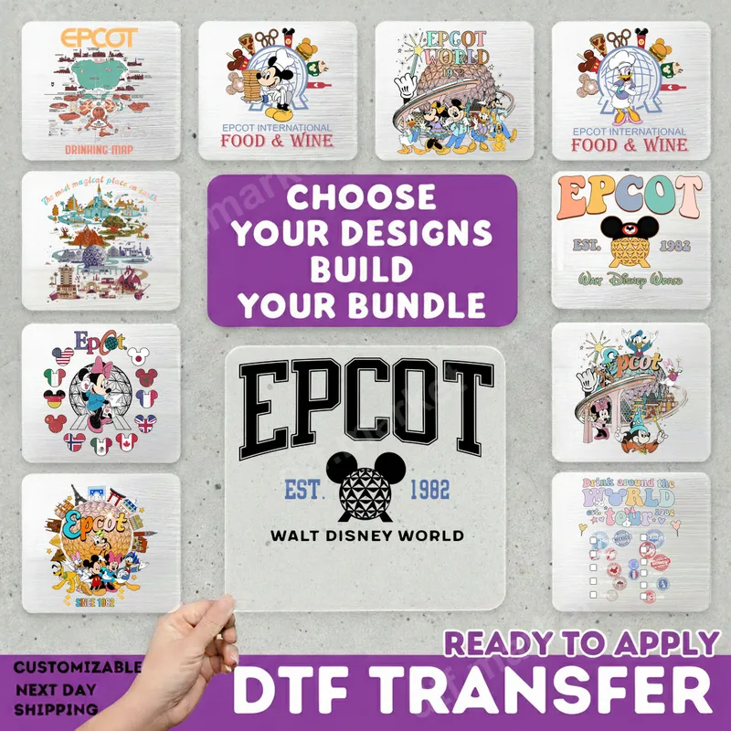 See allThis vibrant collection of EPCOT-themed DTF transfers is perfect for anyone planning a magical visit to Walt Disney World. Each ready to press transfer captures the unique spirit of EPCOT, from Spaceship Earth iconography to festive Food & Wine designs and popular "Drink Around the World" maps. These high-quality direct to film transfers offer a fantastic way to personalize your apparel for an unforgettable Disney vacation, making your trip truly special. These versatile heat press designs are ideal for Disney enthusiasts, families preparing for a theme park getaway, or groups looking for matching outfits. Perfect for celebrating a birthday, family reunion, or just a fun trip with friends, these iron on decals make excellent gifts or personal keepsakes. They are great for travel clubs, bachelorette parties, or anyone wanting to add Disney magic to their wardrobe. Applying your new shirt design is simple and hassle-free. Our heat press transfers are compatible with 100% cotton, 100% polyester, and various cotton/poly blends. For best results, use a heat press at 300-325°F for 15 seconds with medium pressure. Alternatively, a household iron can achieve great results. No complicated weeding or layering is involved; just peel, press, and admire your new custom garment. Experience professional-grade quality with every apparel transfer. Our DTF transfers boast incredibly vibrant colors, crisp details, and exceptional durability that resists cracking and fading, ensuring your design looks great wash after wash. The finished product offers a soft hand feel, integrating seamlessly without the heavy, stiff feel of traditional vinyl transfer. Enjoy long-lasting wear and a premium finish that truly stands out.