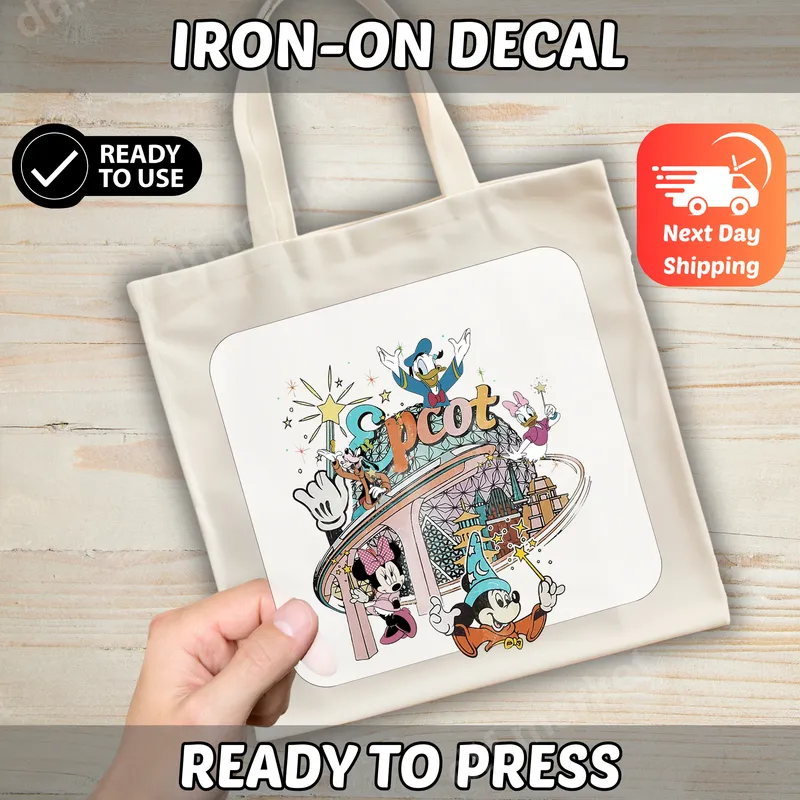 See allThis vibrant DTF transfer captures the magic of Epcot, featuring a delightful ensemble of classic Disney characters including Sorcerer Mickey Mouse, Minnie Mouse, Donald Duck, Daisy Duck, Goofy, and Pluto. Centered around the iconic Spaceship Earth, the design boasts a charming retro aesthetic with sparkling stars, making it a perfect ready to press design for any Disney enthusiast. Ideal for Disney fans planning a trip to Epcot or cherishing past memories, this heat press transfer is perfect for family vacations, themed parties, or as a unique gift. Create custom apparel for your entire family to wear on your next adventure, or simply add a touch of Disney magic to your everyday wardrobe. Our high-quality iron on transfer works seamlessly on a wide range of materials, including cotton, polyester, and various fabric blends. For best results, apply with a heat press at 300-325°F for 15 seconds with medium pressure, followed by a warm or cool peel. It can also be applied with a household iron, making it an accessible t-shirt transfer for everyone. Forget weeding vinyl; simply press and go! Experience professional-grade results with this durable apparel transfer. The colors are incredibly vibrant, resistant to cracking and fading, and the finished design has a soft, lightweight feel on your garment. Crafted using premium DTF film and strong adhesive, this transfer ensures a long-lasting, high-quality finish for all your custom creations.