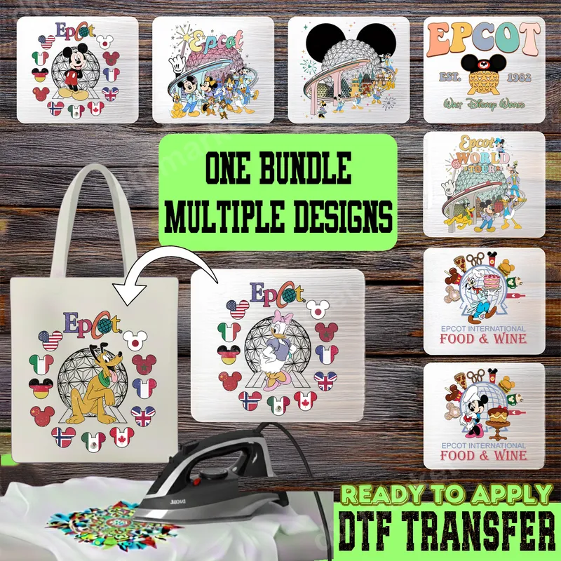 See allThis exclusive Epcot Disney World DTF transfer bundle brings the magic of the iconic park right to your wardrobe. Featuring a vibrant collection of designs, you'll find beloved characters like Mickey Mouse, Minnie Mouse, Donald Duck, Daisy Duck, Goofy, and Pluto exploring Spaceship Earth and the World Showcase. Each ready to press transfer captures the spirit of adventure, international friendship, and culinary delights that make Epcot a favorite destination, offering a mix of classic and Food & Wine Festival themes. Perfect for Disney fans of all ages, this heat transfer bundle is ideal for upcoming Walt Disney World trips, family vacations, or simply expressing your love for Epcot. Create matching shirts for your group, unique gifts for fellow Disney enthusiasts, or personalized apparel for everyday wear. These versatile heat press designs are fantastic for birthday celebrations, travel souvenirs, or adding a touch of magic to your crafting projects. Our premium direct to film transfers are incredibly easy to apply, whether you use a professional heat press or a standard household iron. They adhere beautifully to a wide range of fabrics including cotton, polyester, and various blends, ensuring your design looks fantastic on any garment. Simply press at 300-325°F for 15 seconds with medium pressure, then cold peel for a flawless finish. Best of all, there's absolutely no weeding required, saving you time and effort. Experience professional-grade quality with every iron on transfer in this collection. Crafted using durable DTF film and strong adhesive, these apparel transfers boast incredibly vibrant colors, crisp details, and exceptional durability. They are designed to be crack-resistant, fade-resistant, and incredibly soft to the touch, ensuring your custom t-shirt transfer withstands countless washes and wears while maintaining its original charm and professional look.