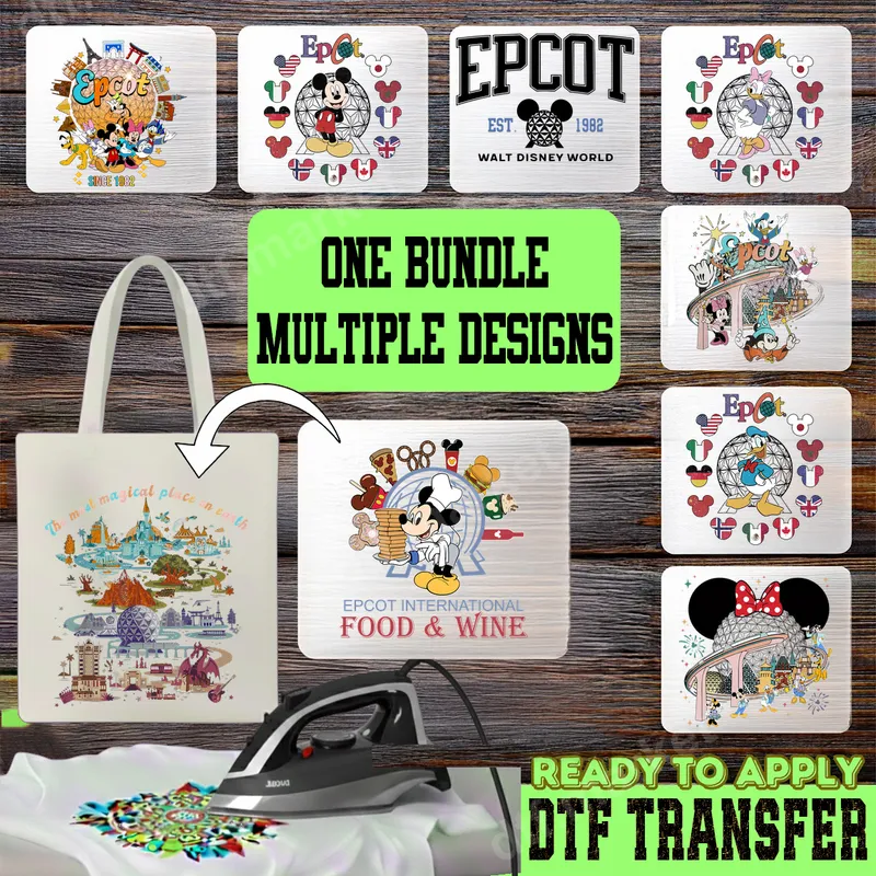 See allThis exciting bundle features a collection of Epcot-themed DTF transfers, bringing the magic of Walt Disney World's iconic park right to your apparel. You'll find beloved characters like Mickey, Minnie, Donald, and Daisy celebrating the World Showcase and classic Epcot motifs, including the famous Spaceship Earth. Each vibrant design is a ready to press direct to film transfer, meticulously crafted to ensure professional results on any garment. Perfect for Disney enthusiasts, Epcot visitors, and anyone who loves unique pop culture apparel, this heat press transfer bundle is ideal for family vacations, Disney-themed parties, or simply adding a touch of magic to your everyday wardrobe. Create custom t-shirts for your next trip, design personalized tote bags, or make thoughtful gifts for fellow Disney fans. These iron on decals are a fantastic way to celebrate your love for Epcot's global charm and culinary delights, especially designs featuring the International Food & Wine Festival. Applying these high-quality heat transfers is incredibly simple. They work flawlessly on a wide range of materials, including 100% cotton, polyester, and various blends. For best results, use a heat press at 300-325°F for 15 seconds with medium pressure, followed by a warm peel. If a heat press isn't available, a household iron can also be used with careful application. Enjoy the convenience of a ready to press transfer with absolutely no weeding required, saving you time and effort. Each design in this Epcot bundle offers exceptional quality, boasting vibrant colors, crisp details, and a soft-hand feel that integrates beautifully with the fabric. Our premium DTF film ensures your t-shirt transfer is incredibly durable, crack-resistant, and washable, maintaining its integrity and bright appearance even after multiple washes. Experience professional-grade apparel transfers that stand the test of time, bringing joy and a touch of Disney wonder to every wear.