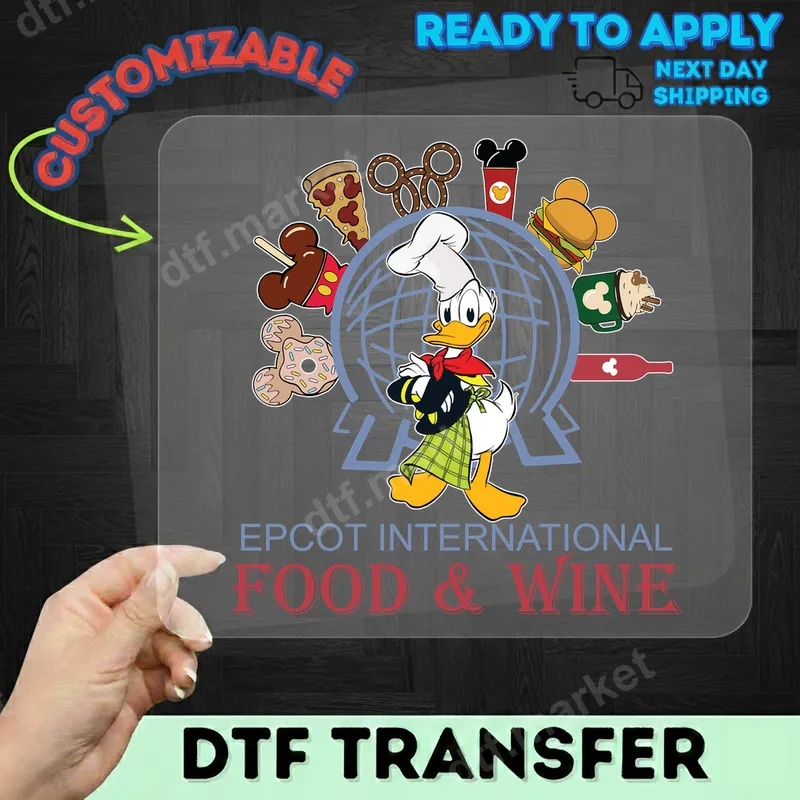 See allIndulge your love for culinary adventures with this charming Epcot Food & Wine Festival Donald Duck Chef DTF transfer. Featuring Donald in his chef's hat, surrounded by iconic Epcot festival treats like Mickey pretzels, pizza, and donuts, this vibrant design captures the spirit of gastronomic exploration. It's a ready to press transfer that brings the magic of the festival straight to your wardrobe, designed to make a statement. This delightful heat press transfer is perfect for Disney enthusiasts, foodies, and anyone who cherishes memories of the Epcot International Food & Wine Festival. It makes an ideal gift for travel companions, family, or friends planning a trip, or as a souvenir. Create custom apparel for festival visits, themed parties, or simply to add a touch of Disney magic to your everyday style. It’s also a fantastic iron on transfer for crafting unique gifts. Applying this apparel transfer is quick and hassle-free, suitable for a wide range of fabrics including cotton, polyester, and their blends. For best results, use a heat press at 300-325°F for 15 seconds with medium pressure. You can even achieve excellent results with a household iron. Unlike traditional vinyl transfer methods, there's no weeding required, making customization easy for everyone. Experience superior quality with this professional-grade DTF transfer. Our direct to film transfers boast incredibly vibrant colors, exceptional durability, and a soft-to-the-touch feel that won't crack or peel. Each heat press design is printed on premium film with strong adhesive, ensuring a long-lasting and professional finish for all your custom creations. Enjoy brilliant, fade-resistant graphics that stand out.
