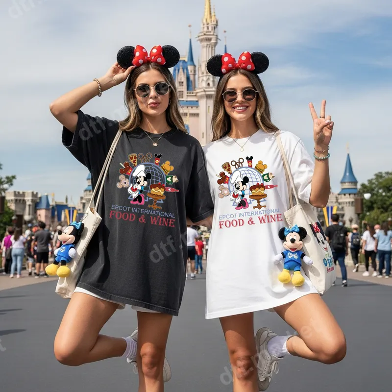 See allStep into the magic of the Epcot International Food & Wine Festival with this charming direct to film transfer. This design features an adorable Chef Mickey alongside Minnie Mouse, encircled by iconic festival eats and global symbols, all centered around the unmistakable Epcot globe. It’s a vibrant, ready to press DTF transfer that perfectly captures the culinary excitement and joy of exploring flavors from around the world at your favorite theme park. This fun heat transfer is ideal for Disney vacationers, foodies, wine enthusiasts, and anyone planning a trip to the Epcot Food & Wine Festival. It’s perfect for creating matching family shirts for your next Disney trip, a unique souvenir for friends, or a thoughtful gift for a fellow Disney adult. Wear it to show off your love for global cuisine, park hopping, and the magic that only Disney can provide. Applying this high-quality iron on transfer is a breeze! Designed for a professional finish, it adheres beautifully to cotton, polyester, and various fabric blends. For best results, use a heat press at 300-325°F for 15 seconds with medium pressure. Even if you don't have a heat press, this apparel transfer can be applied with a household iron (follow instructions carefully). Best of all, there's no tedious weeding required, making customization quick and easy. Experience superior quality with our professional DTF transfers. This t-shirt transfer boasts incredibly vibrant colors, sharp details, and excellent durability. The specialized film ensures a soft hand feel that won't crack or peel, even after multiple washes. Enjoy a long-lasting design that looks fantastic on all your favorite garments, providing a premium custom look that stands out.