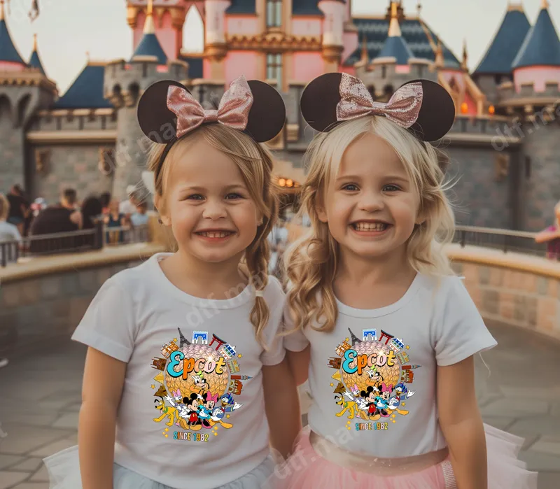 See allThis vibrant DTF transfer celebrates Epcot, featuring its iconic Spaceship Earth globe encircled by beloved Disney characters like Mickey, Minnie, Donald, Daisy, Goofy, and Pluto. Miniature World Showcase landmarks, including the Eiffel Tower and a Japanese torii gate, complete the design, alongside "Epcot SINCE 1982." This high-quality, ready to press design brings a cheerful, vintage theme park vibe to any garment. This Epcot-themed heat transfer is perfect for Disney enthusiasts, families planning a magical vacation, or anyone cherishing the park's history. It makes an ideal gift for birthdays, anniversaries, or as matching apparel for family trips to Walt Disney World. Create custom t-shirts for kids and adults, celebrating Epcot's opening year with this direct to film transfer to commemorate memories or share your love for classic Disney. Applying this iron on transfer is simple and mess-free. Our premium heat press design works beautifully on cotton, polyester, and various blends. For best results, apply with a heat press at 300-325°F for 15 seconds with medium pressure, then cold peel. For smaller projects, a household iron can also be used. Forget weeding vinyl transfers; this ready to press transfer ensures a smooth, professional finish. Experience exceptional quality with our Epcot t-shirt transfer. Crafted using professional-grade DTF film and strong adhesive, this apparel transfer delivers incredibly vibrant colors and sharp details. It's designed to be durable, crack-resistant, and soft to the touch, ensuring comfort and longevity wash after wash. Transform your garments into personalized treasures with a print that looks and feels premium, making your custom transfer truly special.