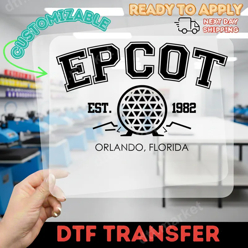 See allCapture the nostalgic charm of Epcot with this classic DTF transfer. Featuring the iconic Spaceship Earth emblem, collegiate 'EPCOT' lettering, and 'EST. 1982 ORLANDO, FLORIDA', this design brings a retro theme park vibe to any garment. It's a high-quality ready to press transfer that makes customizing apparel effortless. Perfect for devoted Disney enthusiasts, families planning their next magical vacation, or anyone who cherishes vintage theme park aesthetics. This heat press design makes an excellent souvenir or a thoughtful gift for birthdays, family trips, or just to show off your love for Epcot. Create matching shirts for your group or a unique piece to wear around the park. Applying this durable iron on transfer is incredibly simple. Use a heat press set between 300-325°F for 15 seconds with medium pressure, then give it a cold peel. If using a household iron, ensure even, firm pressure. No tedious weeding or intricate cutting is needed, making garment decoration quick and enjoyable. It works flawlessly on cotton, polyester, and various fabric blends. Experience vibrant colors and exceptional detail with our premium t-shirt transfer. Each direct to film transfer is crafted from professional-grade DTF film, ensuring excellent stretch, crack resistance, and a soft-to-the-touch finish. Your custom creations will stand up to countless washes, maintaining their pristine look and feel for years to come.