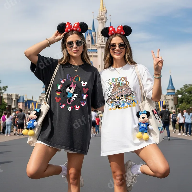 See allThis cheerful DTF transfer captures the magic of EPCOT World, featuring beloved Disney characters Mickey Mouse, Minnie Mouse, Donald Duck, Daisy Duck, Goofy, Pluto, and Chip 'n' Dale. They are gathered joyfully in front of the iconic Spaceship Earth. This vibrant, ready to press design is perfect for anyone looking to bring a piece of the Walt Disney World experience home, embodying the fun and excitement of an EPCOT visit. Ideal for Disney enthusiasts, families planning a theme park vacation, or anyone cherishing EPCOT memories. This versatile design makes a fantastic apparel transfer for matching family shirts, souvenir tees, or custom gifts for birthdays and holiday trips. Create personalized shirts for your next Disney trip or surprise a fellow fan with a unique heat press design. Our high-quality heat transfer is incredibly easy to apply, working seamlessly on almost any fabric type, including cotton, polyester, and various blends. For best results, use a heat press at 300-325°F for 15 seconds with medium pressure, then cool peel. No specialized skills or tedious weeding are required, making this an ideal iron on transfer for crafters and DIY enthusiasts. Experience professional-grade results with our durable DTF transfers. Each direct to film transfer boasts vibrant colors and sharp details that resist cracking and fading, ensuring your custom apparel looks great wash after wash. The soft-touch finish integrates smoothly with fabric, providing comfort. Crafted with premium DTF film and strong adhesive, these transfers deliver a long-lasting, high-quality shirt design every time.