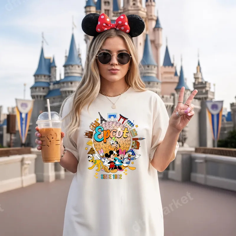 See allThis vibrant DTF transfer captures the spirit of Epcot with its iconic Spaceship Earth globe, surrounded by detailed World Showcase landmarks like the Eiffel Tower and Japanese pagoda. Classic Disney characters including Mickey, Minnie, Donald, Goofy, Pluto, and Daisy are playfully arranged around the globe, with 'Epcot' prominently displayed and 'Since 1982' celebrating its heritage. This ready to press design brings a touch of magic and nostalgia to any garment. Perfect for Disney enthusiasts, Epcot visitors, and families planning their next magical vacation. This iron on transfer makes an excellent gift for birthdays, family reunions, or friend trips, allowing everyone to create matching apparel. Celebrate a special memory or simply show off your love for the most global of Disney parks with a unique, custom look. Applying this high-quality heat press transfer is incredibly simple. It adheres seamlessly to a wide range of materials, including 100% cotton, polyester, and various blends. For best results, use a heat press at 300-325°F for 15 seconds with medium pressure. No heat press? A household iron can also be used following careful instructions. Say goodbye to tedious weeding – this heat press design is truly ready to apply! Experience unparalleled color vibrancy and crisp detail with our professional-grade DTF transfers. Engineered for durability, this t-shirt transfer is crack-resistant, peel-resistant, and boasts a soft, lightweight feel on the fabric. Our premium DTF film ensures strong adhesive and a long-lasting apparel transfer that stands up to countless washes, keeping your Epcot memories alive for years to come.