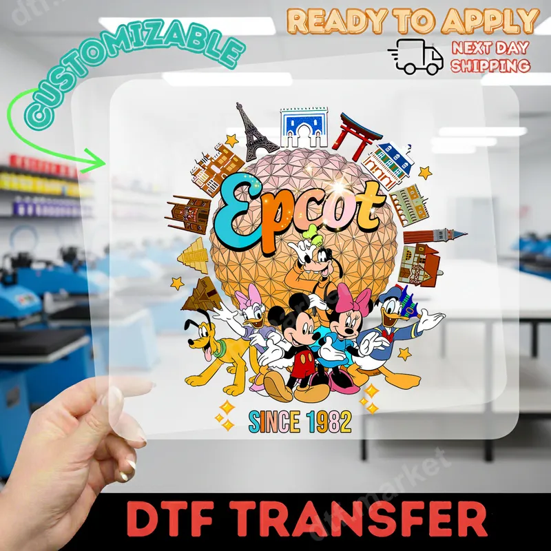See allThis vibrant Epcot DTF transfer brings the magic of Walt Disney World's World Showcase to your wardrobe. The design features a colorful Spaceship Earth, surrounded by beloved Disney characters like Mickey, Minnie, Goofy, Donald, Daisy, and Pluto, alongside miniature landmarks from various countries. "SINCE 1982" commemorates the park's opening. This delightful, ready to press design perfectly captures Epcot's spirit of adventure and friendship. Ideal for Disney enthusiasts, families planning an Epcot trip, or anyone cherishing park memories, this heat transfer is a fantastic way to express fandom. It's a wonderful personalized gift for birthdays, vacations, or for matching family shirts. Create unique apparel for park days, themed parties, or everyday wear with this fun custom transfer. Applying this professional-grade heat press transfer is straightforward, whether you use a heat press or a household iron. Our high-quality iron on transfer adheres beautifully to cotton, polyester, and blends. For best results, use a heat press at 300-325°F for 15 seconds with medium pressure, then cool peel. No weeding needed – simply press and enjoy your new t-shirt transfer. Experience superior quality with this DTF transfer. The colors are incredibly vibrant, sharp, and resist cracking and fading, ensuring your garment looks great wash after wash. The finished heat press ready design has a soft, lightweight feel, making it comfortable. This apparel transfer, printed on durable film with strong adhesive, guarantees a professional, long-lasting finish.