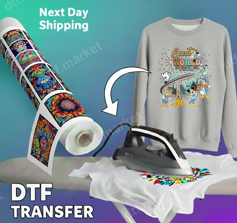 See allDive into nostalgia with this vibrant Epcot World Tour '82 DTF transfer, celebrating the iconic theme park's opening year with a full cast of classic Disney characters. Featuring Mickey Mouse, Minnie, Donald, Daisy, Goofy, and Pluto around Spaceship Earth, this colorful design captures the timeless charm of Epcot's early days. This high-quality direct to film transfer is ready to press, allowing you to easily personalize your apparel with a touch of retro Disney magic. Perfect for Disney enthusiasts, Epcot veterans, and anyone who loves a touch of vintage flair, this heat press transfer makes an excellent gift for birthdays, family vacations, or just to show off your fandom. Ideal for Disney World trips, family reunions, or crafting custom apparel for theme park visits, this design brings back cherished memories and creates new ones. It’s also a fantastic way to commemorate a trip or simply add some fun to your everyday wardrobe. Applying this iron on transfer is simple and hassle-free. Our ready to press transfer works beautifully on a wide variety of materials, including cotton, polyester, and cotton/poly blends. For best results, use a heat press at 300-325°F (150-163°C) for 15 seconds with medium pressure, then cold peel the film. A household iron can also be used with care. There's no tedious weeding required, making customization quick and easy for crafters and businesses alike. Crafted with professional-grade DTF film, this apparel transfer ensures vibrant colors that pop and a soft, flexible feel that won't crack or peel. Each heat press ready design is produced with strong adhesive backing for excellent wash durability, maintaining its crisp look through countless wears and washes. Enjoy professional-quality results right from your home or workshop, turning ordinary garments into extraordinary, personalized pieces.