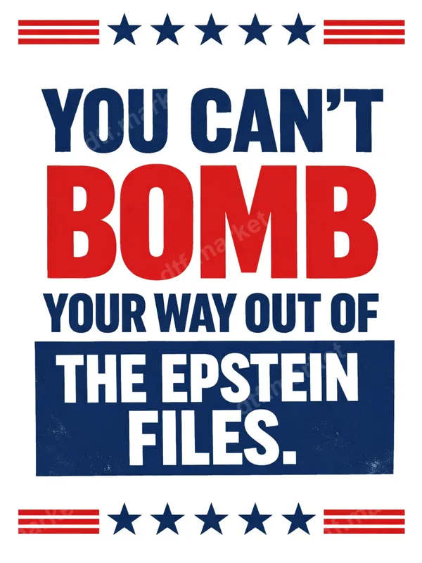 See allThis impactful DTF transfer features a bold political statement: "YOU CAN'T BOMB YOUR WAY OUT OF THE EPSTEIN FILES." Rendered in patriotic red, white, and blue with a distressed, vintage poster aesthetic, this design demands attention. It's a powerful ready to press transfer for those who believe in accountability and aren't afraid to speak truth to power, offering a visually striking way to share your critical perspective. This powerful heat press design is perfect for political activists, truth-seekers, and anyone who wishes to spark conversation and challenge narratives. Ideal for expressing your views at rallies, community events, or simply as everyday wear. It makes a thought-provoking gift for friends and family who share a critical perspective on global events and demand transparency and justice. Our DTF transfers are incredibly versatile and easy to apply. This heat transfer works seamlessly on a wide range of fabrics, including cotton, polyester, and various blends. Achieve professional results using a heat press at 280-300°F for 6-10 seconds with medium pressure, followed by an instant peel. For household iron users, ensure even, firm pressure. Best of all, there's no tedious weeding required, making customization quick and hassle-free. Experience superior quality with every apparel transfer. Our direct to film transfers boast vibrant colors that pop, offering excellent crack resistance and a soft, flexible feel on your garment. Crafted with professional-grade DTF film, these transfers feature strong adhesive properties, ensuring your custom transfer design remains durable and long-lasting through countless washes, keeping your message clear and impactful.