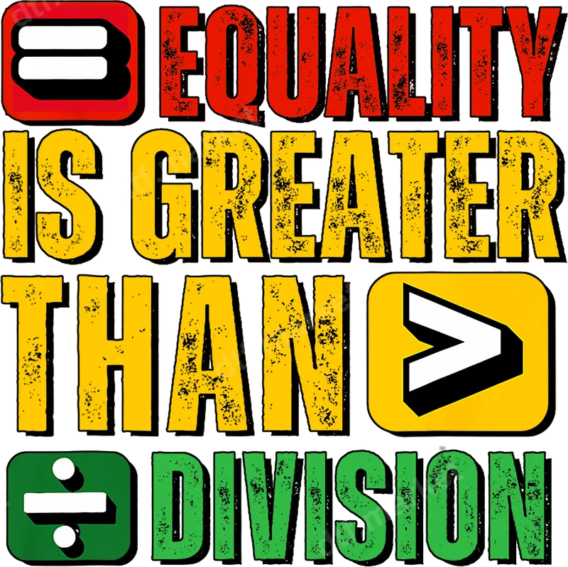 See allThis impactful DTF transfer features "Equality Is Greater Than Division," creatively expressed with distressed typography and mathematical symbols (=, >, ÷). The design uses bold red, vibrant yellow, and strong green, giving it a striking, grungy aesthetic. This ready to press transfer is perfect for making a statement and promoting unity and social justice. This design is ideal for activists, educators, students, and anyone passionate about human rights and inclusivity. It's a fantastic choice for protests, rallies, school events, or as everyday wear to express your values. Gift this versatile heat transfer to friends, family, or colleagues who advocate for a more equitable world, making a thoughtful gift for any occasion. Our high-quality apparel transfers are designed for easy application using a heat press (recommended 300-325°F for 15 seconds, medium pressure) or a household iron. These iron-on decals are suitable for cotton, polyester, and blends, ensuring versatility. Forget tedious weeding; simply press your heat press design onto your garment for a professional finish. Experience superior quality with our durable and vibrant DTF transfers. Printed using professional-grade DTF film and inks, colors remain bright and resist cracking, peeling, or fading. The soft-touch finish integrates seamlessly with the fabric, providing comfort. These ready to press transfers offer excellent wash durability, maintaining integrity after multiple washes for a long-lasting addition.