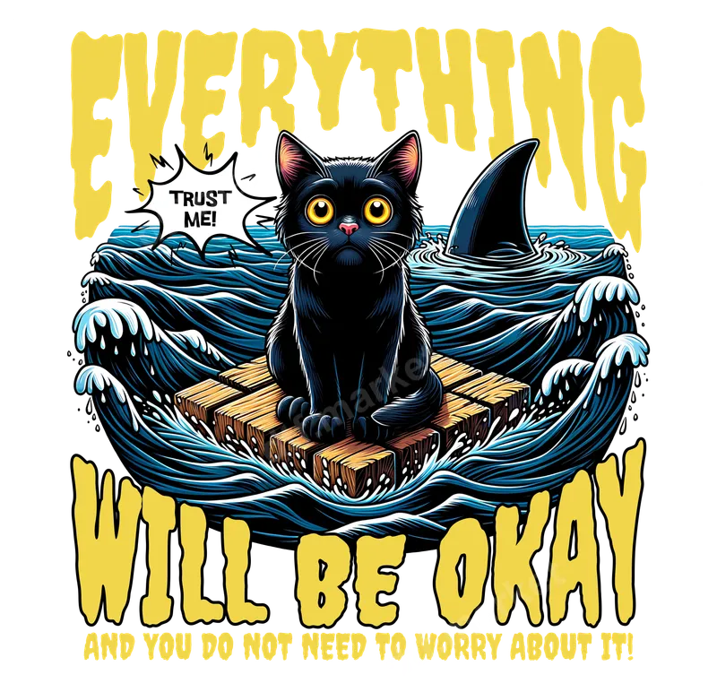 See allDive into the quirky side of optimism with this unique 'Everything Will Be Okay' DTF transfer. Featuring a wide-eyed black cat calmly perched on a wooden raft amidst stormy blue waves and a lurking shark fin, the design ironically declares, "EVERYTHING WILL BE OKAY AND YOU DO NOT NEED TO WORRY ABOUT IT!" with the cat's speech bubble adding a deadpan "TRUST ME!". This ready to press design combines a touch of dark humor with a comforting, albeit sarcastic, message. This heat press ready graphic is perfect for cat lovers, fans of sarcastic humor, or anyone who appreciates a good laugh in the face of adversity. It makes an excellent gift for birthdays, a cheer-up present for a friend, or a fun addition to your own wardrobe for everyday wear. Showcase your unique perspective with this engaging and conversation-starting design. Applying this transfer is a breeze. It's compatible with a wide range of fabrics, including cotton, polyester, and blends. Simply use a heat press at 300-325°F for 15 seconds with medium pressure, then cold peel for a flawless finish. Even with a household iron, you can achieve great results. Best of all, this heat transfer requires no weeding, saving you time and effort. Experience professional-grade quality with every direct to film transfer. Our designs are known for their vibrant colors, exceptional durability, and crack-resistant finish, ensuring your apparel looks fantastic wash after wash. The soft-touch feel and strong adhesive mean this iron on transfer will last, maintaining its vivid detail and unique charm for years to come.