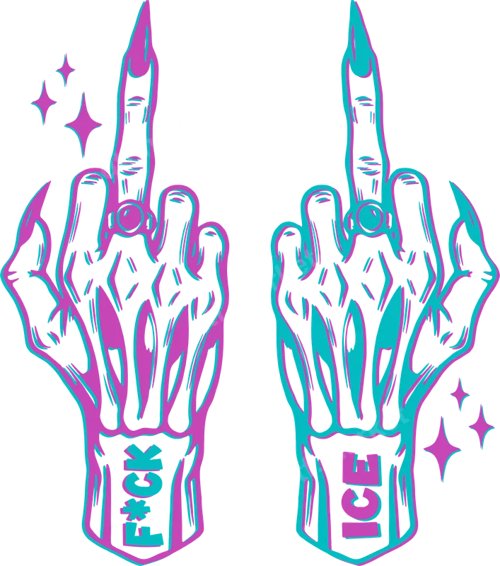 See allThis vibrant DTF transfer showcases an edgy, dual-skeleton hand design, each making a defiant middle finger gesture. One hand boldly displays "F*CK" while the other features "ICE" (upside down), rendered in striking neon pink and teal colors that create a captivating glitch or 3D effect. This ready to press heat transfer is perfect for those wanting to make an unapologetic statement with their apparel, blending gothic aesthetics with rebellious counter-culture energy. This design is tailored for individuals unafraid to express strong opinions and a rebellious spirit. It's ideal for activists, protesters, or anyone looking to make a bold political statement. Perfect for casual wear, concerts, rallies, or as a provocative gift for friends with a similar punk rock or anti-establishment attitude. It appeals to those who appreciate dark humor, sarcastic messages, and unique streetwear fashion. Applying this heat press design is incredibly simple. Our direct to film transfer works seamlessly on most fabrics, including cotton, polyester, and blends. For best results, use a heat press at 300-325°F for 15 seconds with medium pressure, then cold peel. A household iron can also be used for smaller applications. Enjoy a quick, professional finish with absolutely no weeding required, making custom apparel accessible. Crafted for exceptional quality and durability, this apparel transfer promises vibrant, true-to-color results that stand out. Our professional DTF film ensures your design is crack-resistant, peel-resistant, and incredibly soft to the touch, integrating smoothly with your garment. The strong adhesive provides a long-lasting bond, ensuring your custom t-shirt transfer withstands numerous washes without fading.