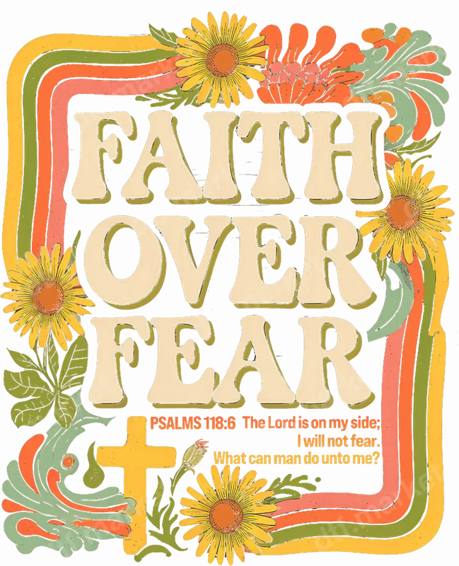 See allThis inspiring DTF transfer design beautifully combines a powerful message with a charming retro aesthetic. Featuring the bold declaration "FAITH OVER FEAR" in a groovy, vintage-style font, it’s surrounded by a burst of vibrant yellow sunflowers, intricate orange and green floral swirls, and a subtle golden cross. The warm, earthy color palette evokes a comforting, nostalgic feel, perfectly complemented by the profound Bible verse, Psalms 118:6: "The Lord is on my side; I will not fear. What can man do unto me?" This high-quality DTF transfer arrives ready to press, allowing you to instantly personalize garments with a message of spiritual strength. This design is perfect for individuals seeking daily inspiration, Christian communities, or anyone looking to share a message of resilience and trust. It's an ideal iron on transfer for church groups, youth retreats, or as heartfelt gifts for friends, family, or mentors on any occasion. Small t-shirt businesses and crafters will find this versatile heat transfer design invaluable for creating unique merchandise that resonates deeply with a faith-based audience, offering both style and spiritual encouragement. Applying this heat press transfer is simple and efficient, adhering flawlessly to a wide range of materials including cotton, polyester, cotton-poly blends, and even nylon. Achieve professional results with a heat press (recommended at 300-325°F for 15 seconds with medium pressure) or a standard household iron. The beauty of this design lies in its ease of use – no weeding or complex layering required. Simply peel and press! It's perfect for custom t-shirts, hoodies, sweatshirts, tote bags, pillow covers, and even adding a personal touch to denim jackets. For long-lasting vibrancy and durability, wash your customized items inside out and tumble dry on a low setting. Our ready to press transfer ensures vivid, full-color printing with exceptional detail and clarity, making every element of the retro design pop. It’s crafted to be crack-resistant and soft to the touch, avoiding the stiff, heavy feel often associated with traditional vinyl transfers. Each direct to film transfer is produced on premium DTF film with a strong adhesive backing, guaranteeing professional-grade results and enduring wear, making it a reliable choice for all your apparel customization needs.